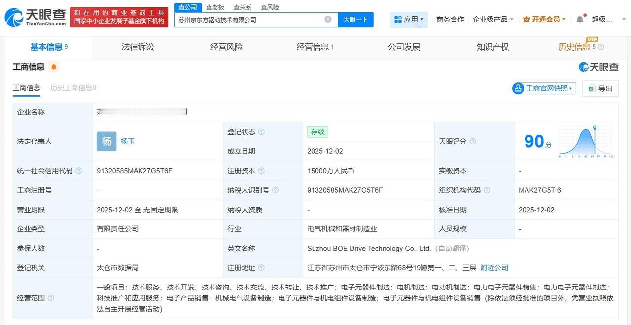 京东方、埃斯顿在苏州成立驱动技术公司注册资本1.5亿 天眼查App显示,近日,苏州京东方驱动技术有限公司成立,法定代表人为杨玉,注册资本1.5亿人民币,经营范围包括电子元器件制造、电机制造、电动机制造、机械电气设备制造等。股东信息显示,该公司由苏州京东方传感技术有限公司、埃斯顿共同持股。 据报道,此前,埃斯顿公告,公司拟与苏州京东方传感技术有限公司签署《投资合作协议》,共同投资设立合资公司,开展伺服相关业务。 天眼查信息: