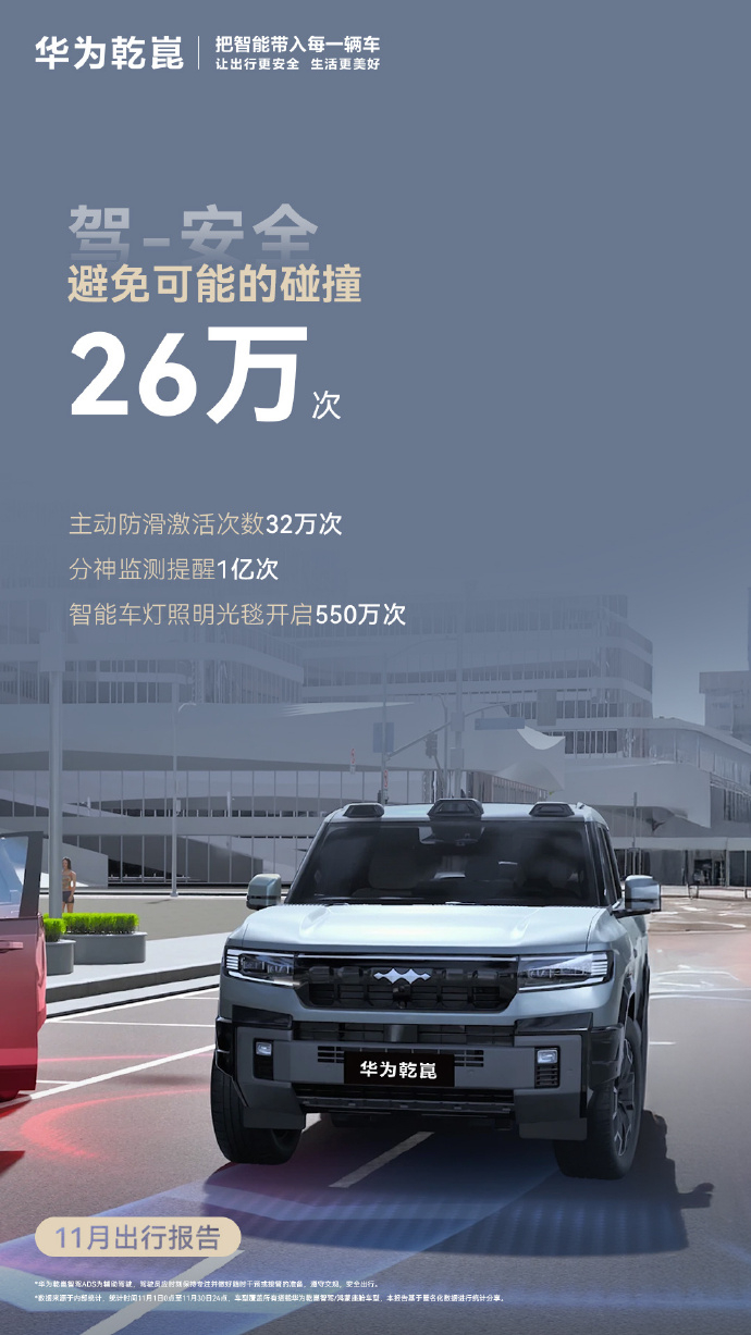 车若初见 华为乾崑发布11月出行报告,辅助驾驶累计肯定是增加的,这不用多说。有几个小项大家可关注下,随天气变冷,主动防滑次数明显高于上月(上月27万次)。分神提醒也都是月均上亿次,再就是晕车舒缓功能也大幅高于上月。晕车舒缓2.0比1.0所用场景更多,不光是跟车、启停等这种简单的场景,现在拐弯,坑洼路也都能优化,所以功能使用率自然增加不少