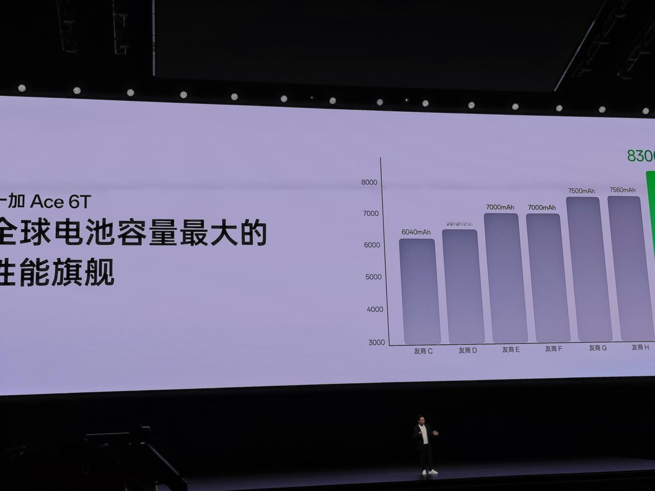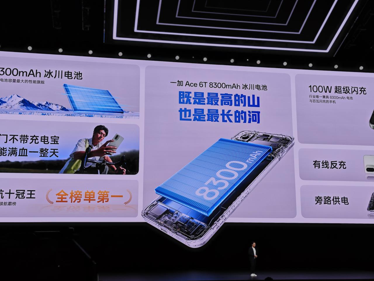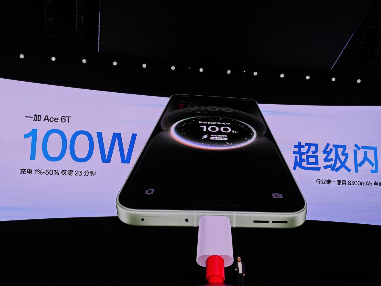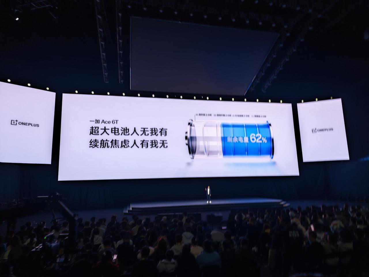 一加Ace 6T内置8300mAh电池,比街上很多共享充电宝的容量还大,可以连续玩10个小时《王者荣耀》,重度使用8小时仍然还剩62%的电量。它还支持100W超级闪充,从1到50%只需要23分钟。还支持有线反充,给别的手机充电,以后出门不用再带充电宝了。