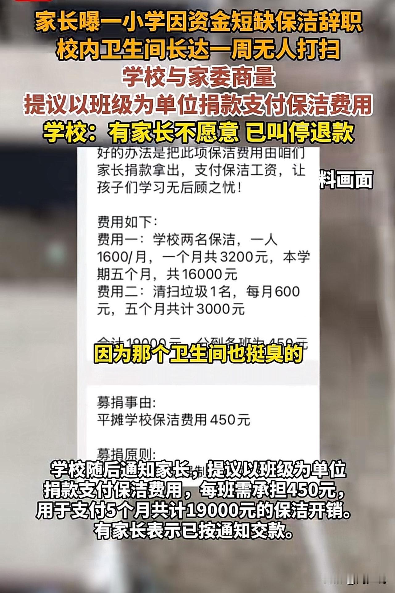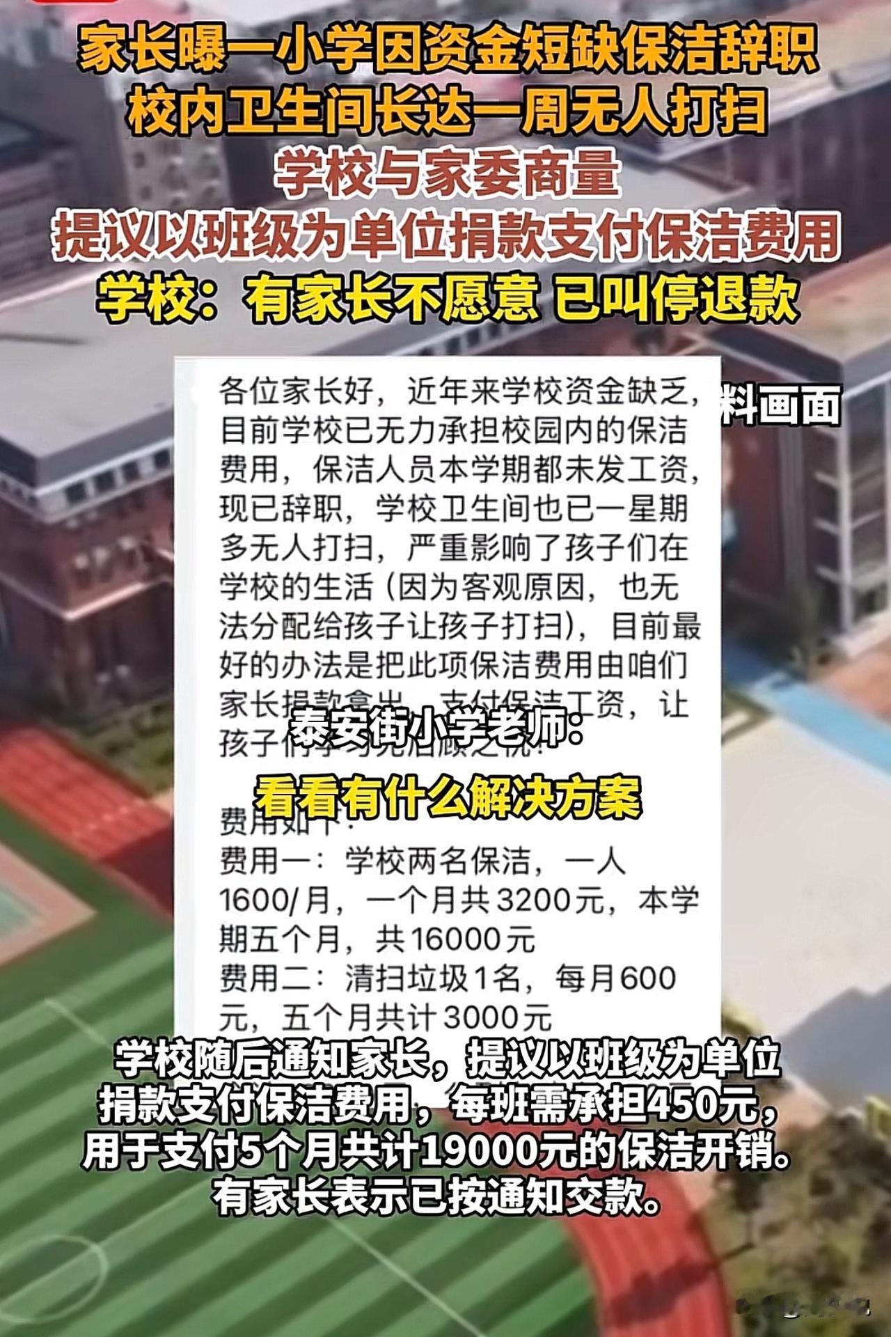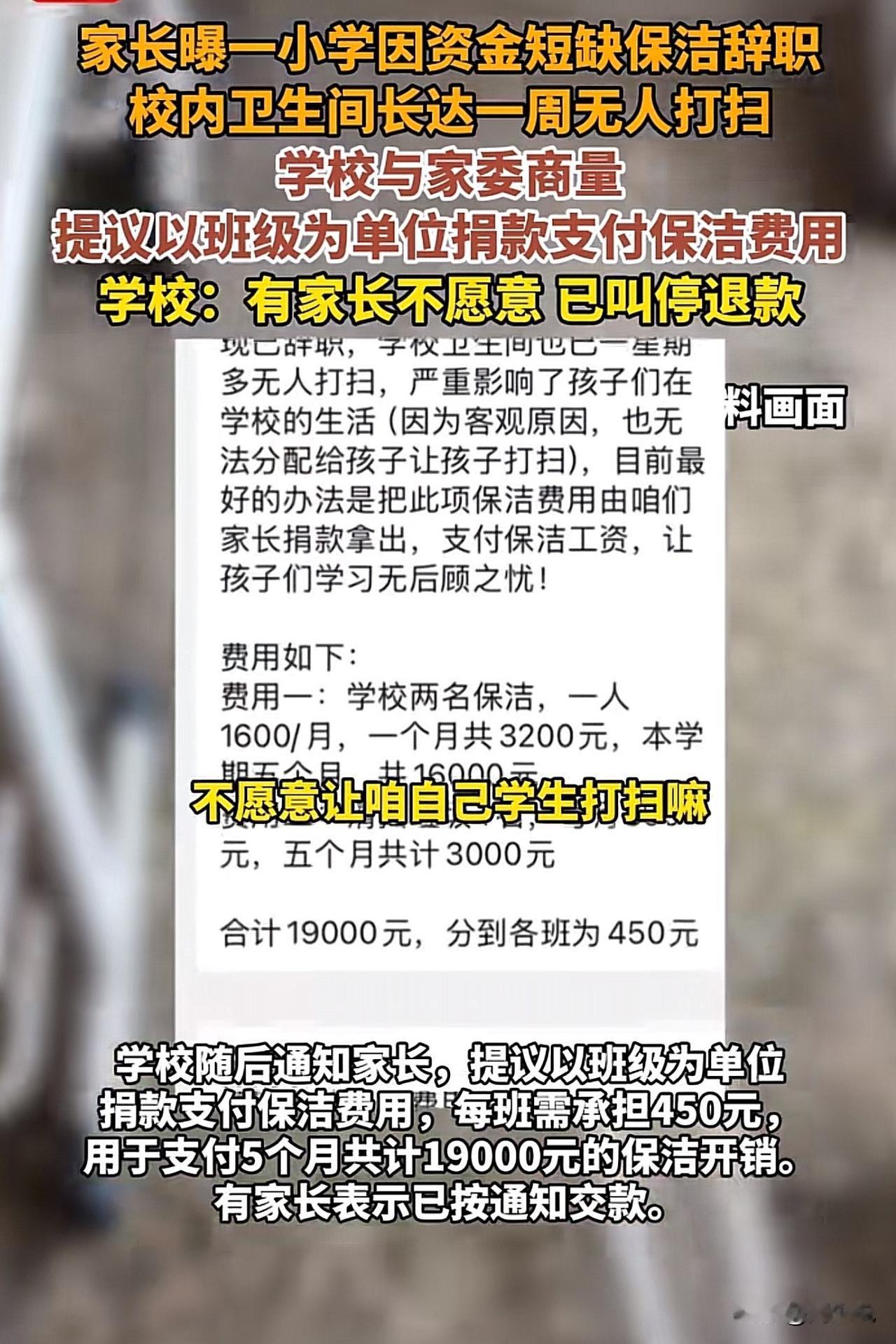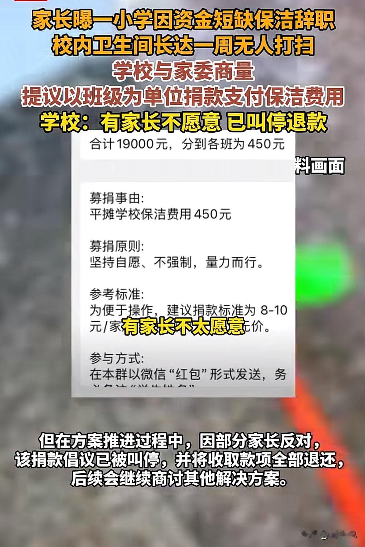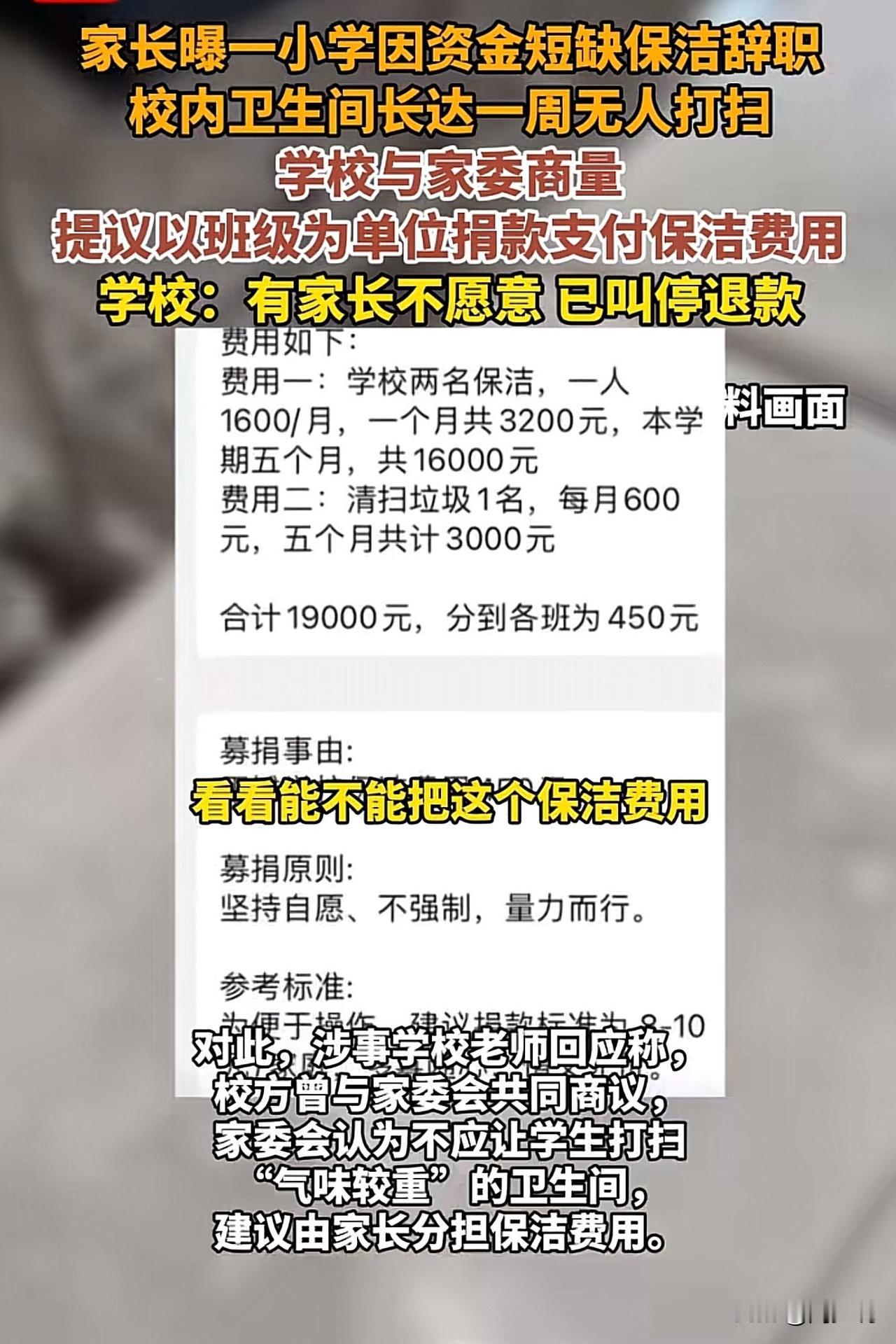 #MCN双量进阶计划#“真是罕见!”湖南一家长爆料,当地某小学因资金短缺,保洁员无奈辞职,校内卫生间竟长达一周无人打扫,环境脏乱差到难以入目,学生们苦不堪言。 眼看情况愈演愈烈,学校与家委会紧急商量后,提出以班级为单位让家长捐款,用这笔钱支付保洁费用。消息一出,迅速在家长群引发轩然大波。 有家长表示理解学校难处,愿意尽一份力; 但也有家长强烈反对,认为保障校园基础卫生是学校的责任,不应将这笔开支转嫁到家长身上。 迫于争议压力,学校最终叫停捐款计划,并将已收款项全额退还。 此事也引发众多网友议论纷纷,不少网友纷纷表示:“校园卫生是学校的基本职责,资金再紧张也不能让家长买单,这是在推卸责任!” 看完这事,周少想说校园基础保障的资金落实是学校的核心责任,卫生间无人打扫不仅影响学生身心健康,更暴露了管理上的疏漏。 家长捐款只能是特殊情况下的自愿补充,而非解决问题的常规手段。教育的本质是责任与担当,学校应主动协调资源解决资金难题,而非将压力进而转嫁给家长。 客观的说,这种方式确实不妥,不能让家长买单,唯有守住这份责任底线,才能为孩子们营造更健康的成长环境,这也是公众对教育机构的基本期待。 对于该校这种行为,大家怎么看呢?#寻美三湘# #长沙新朋友#