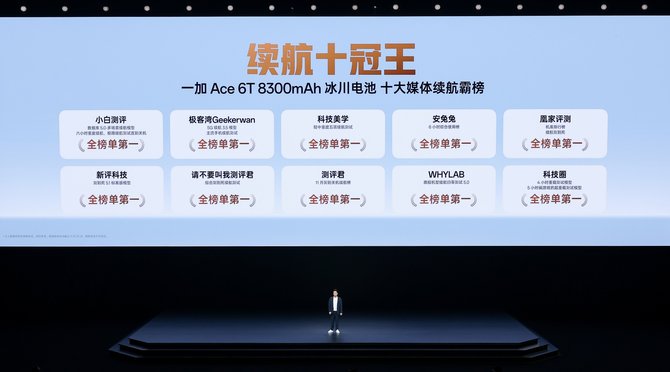 一加Ace6T配备8300mAh超巨量冰川电池,支持100W超级闪充,是行业中唯一兼具8300mAh电池和百瓦闪充的机型,续航实力异常强悍,霸榜10大专业科技媒体续航实测榜单榜首,成为当之无愧的“续航十冠王”。