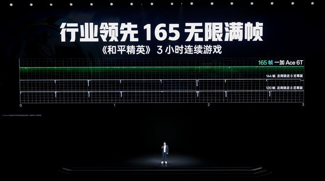 一加Ace6T将独家自研的全新一代「风驰游戏内核」写入第五代骁龙8芯片底层,充分释放这颗芯片全部性能,大幅提升游戏表现。在风驰游戏内核的加持下,一加Ace6T可以轻松驾驭165超高帧游戏,实现同档唯一165无限满帧游戏体验。相比主流手机的120帧,一加Ace6T的165超高帧游戏每秒画面显示数量多45帧,画面显示速度提升27%,全链路操作时延缩短10ms,每秒操控速度提升17%,操作响应快人一步,不仅提高了游戏的流畅性,也提高了游戏的胜率。实测显示,一加Ace6T连续运行《和平精英》3小时,帧率持久流畅,帧率稳定性优于同等环境下友商骁龙8至尊版机型的120帧或144帧游戏表现,且在1%Low帧表现上也做到引领。