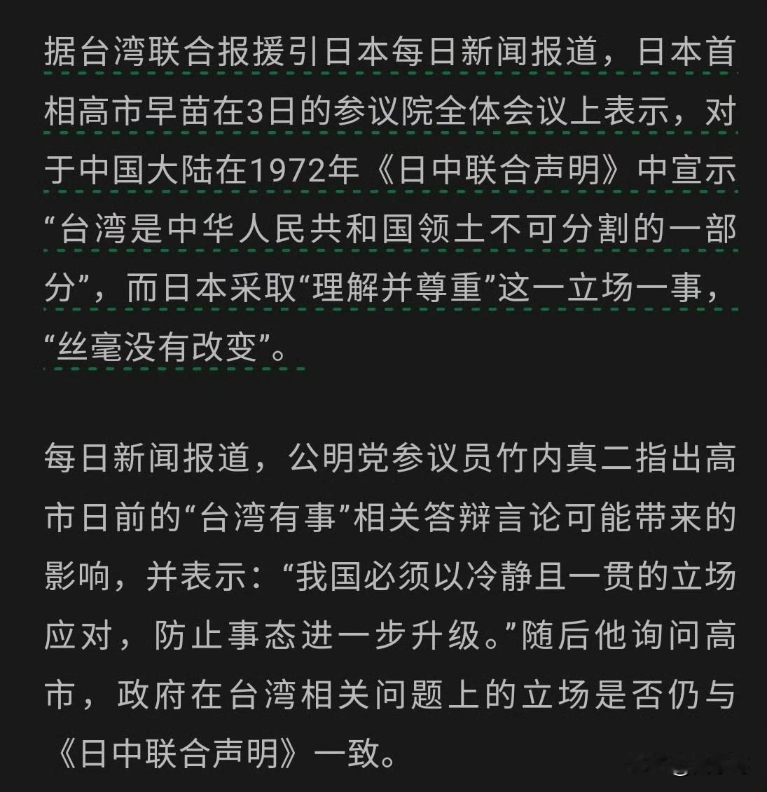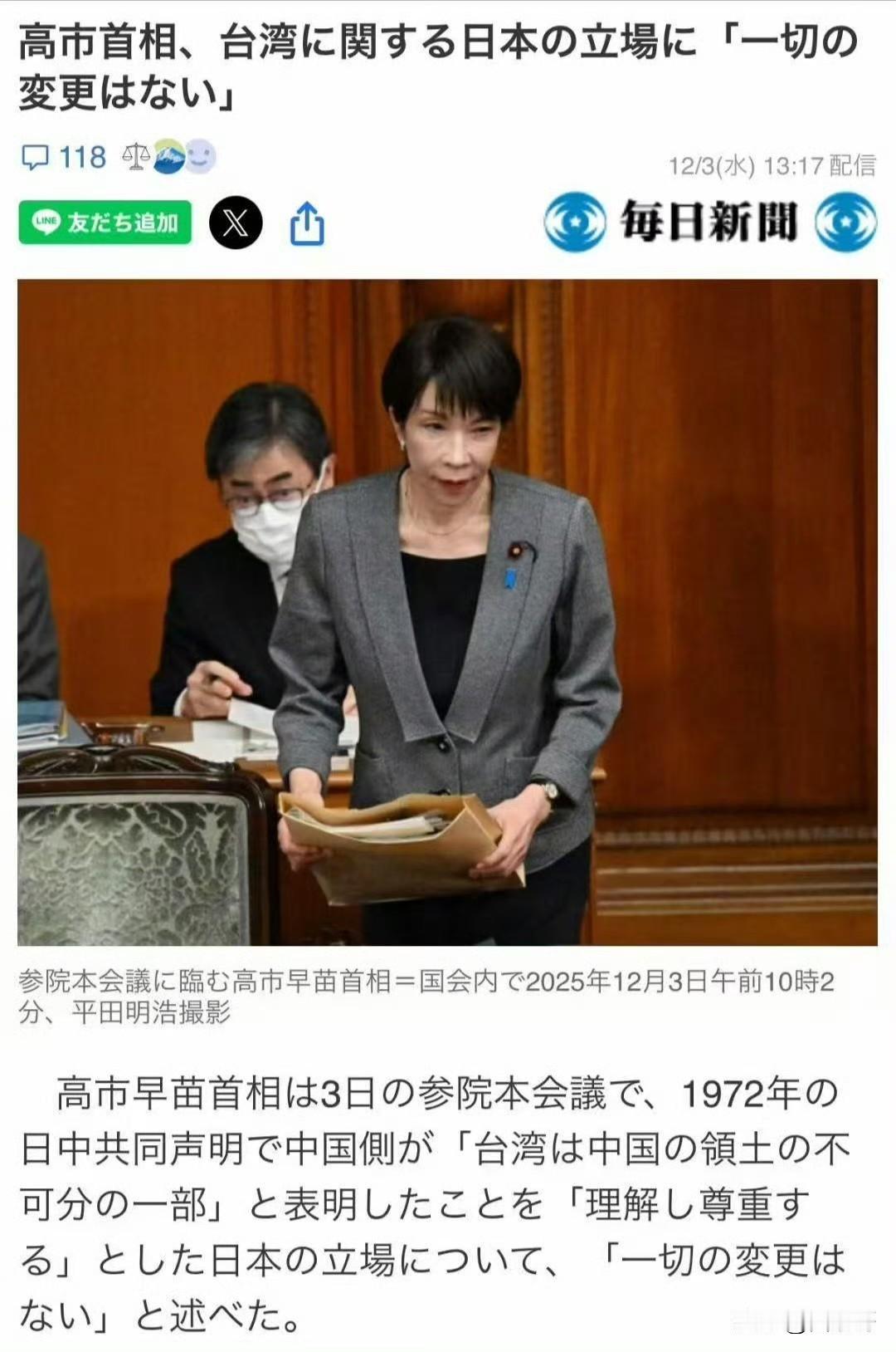 日本突然怂了,高市早苗改口风了,因高市涉台海局势问题谬论所引发中日两国之间的风波,似乎又出现了转折。 12月3日,高市早苗在日本参议院接受质询时表示,日本理解并尊重“台湾是中国领土不可分割的一部分”这一立场,这点“丝毫没有改变”。 但是,高市早苗依然没有撤回此前“台湾有事就是日本有事”的错误言论,这也符合日本人喜欢玩弄文字游戏的风格,为后续再次调整立场留下足够空间,这是日本的狡猾之处。 因此,对于高市早苗的此番表态,既要“听其言”,更要“观其行”,防止日本耍“以退为进”的花招。因为日本一直都在暗地里加紧扩充军备,其对外侵略野心丝毫没有因“二战”失败而减少,咱们应该提前应对,做好必要的准备。