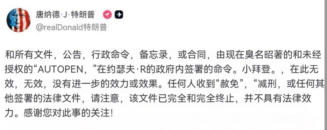 特朗普表示,任何拜登使用“未经授权的自动笔”签署的文件,包括赦免令和减刑令,均无效且不再具有法律效力:所有在小约瑟夫·R·拜登政府时期,由臭名昭著且未经授权的“自动笔”签署的文件、公告、行政命令、备忘录或合同,均被宣布无效,不再具有任何法律效力。任何收到如此签署的“赦免令”、“减刑令”或其他任何法律文件的人士请注意,该文件已被完全终止,不再具有任何法律效力。海外新鲜事热点现场