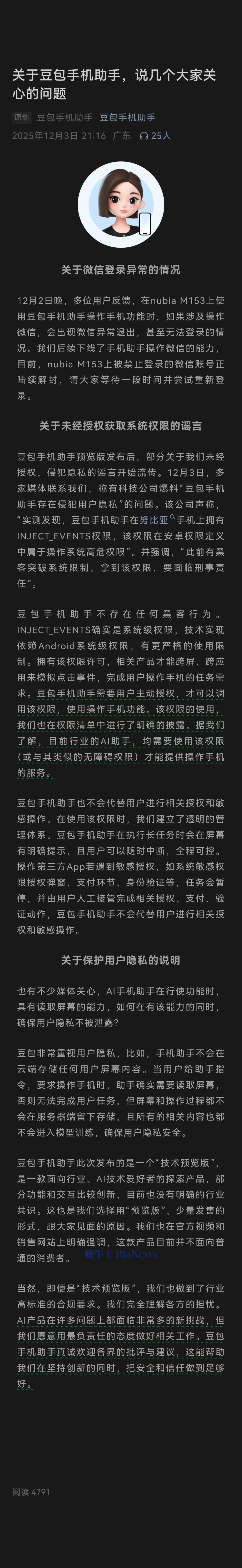 事件最早于12月2日晚出现,多位用户反馈,在nubiaM153手机上通过豆包手机助手执行涉及微信的操作时,会出现应用异常退出,部分账号甚至短时无法重新登录。豆包方面表示,该问题与手机助手在该设备上调用微信操作能力有关,团队随后下线了涉及微信的自动化功能。目前,受影响的账号正在陆续解封,建议用户等待一段时间后再尝试登录。