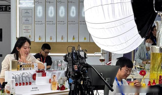 图为在南京举行的中国香妆产业博览会现场,林清轩展台的工作人员正在直播带货。(图片由CNSPHOTO提供)