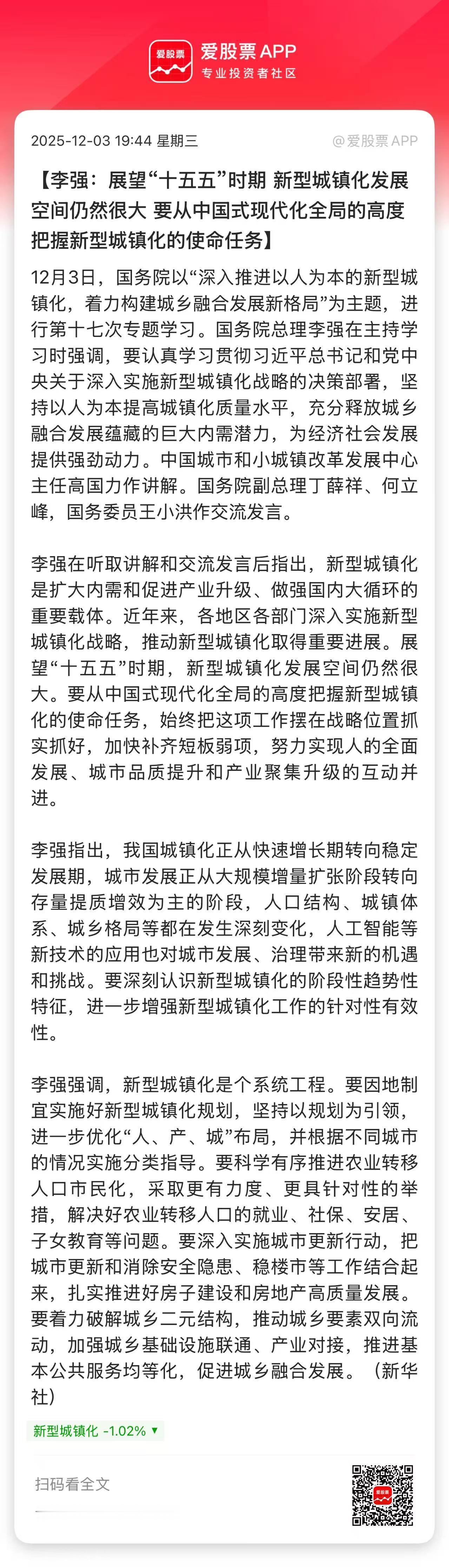 国务院第十七次专题学习,重点是房地产和新型城镇化! 主要定调了两点,1、型城镇化是扩大内需和促进产业升级、做强国内大循环的重要载体;2、十五五时期,新型城镇化发展空间仍然很大,始终把这项工作摆在战略位置抓实抓好。 盘后媒体发表社论,楼市健康发展不容被“带节奏”;现在对楼市悲观论太多,导致房地产下行超过预期! 大家看一线城市的新房、有二手房价格,已经连续6~7个月下滑了。在这种情况下,大家都不敢买房,有房子的也不敢消费,对经济、对内需消费的影响确实不小。