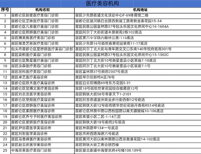 现将昆区辖区内持证医疗美容机构名单公示如下,请大家按需选择: