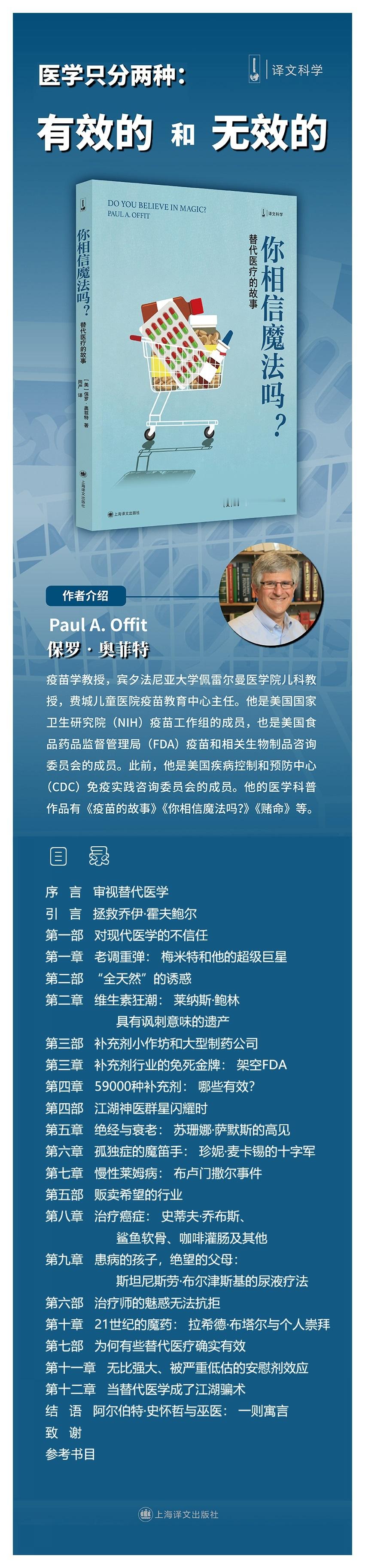 经济人的人文素养阅读书摘 【只有有效的医学和无效的医学 ——读《你相信魔法吗?替代医疗的故事》】 * 《你相信魔法吗?替代医疗的故事》(DO YOU BELIEVE IN MAGIC?), 保罗 · 奥菲特 著, 周 严 译, 上海译文出版社 2025年5月出版。 [ “第一财经”《阅读周刊》编者按 ] 美国人热衷于替代医学。他们去看针灸师、整脊师或自然疗法医师来缓解疼痛,服用银杏来增强记忆力, 使用顺势疗法治疗流感, 服用大剂量维生素补充能量,使用印度香料增强免疫力。这是一个年消费额达340亿美元的产业。 医学教授、科普作家保罗 · 奥菲特发现,如今在美国,替代医学已进入主流。2010年,对6000家医院进行的一项调查发现,42%的医院提供某种形式的替代疗法。当被问及原因时,几乎所有医院的回答都是“患者需求”。 面对疾病和死亡的威胁,每个人都可能暴露出脆弱的一面。只要医学不能彻底消灭疾病,就始终会有患者希望出现奇迹。替代医学寄托着希望和念想,也可能成为资本和骗局的温床。 在《你相信魔法吗?替代医疗的故事》中,奥菲特对替代医学展开了批判性审视,试图将事实和传说区分开。他相信,并不存在什么传统医学、替代医学、补充医学或整体医学。只有有效的医学和无效的医学。 * 点击链接,收看经出版社授权、节选自《你相信魔法吗?替代医疗的故事》一书第三部第四章的部分内容:市面上有五万多种膳食补充剂,哪四种确实有效?
