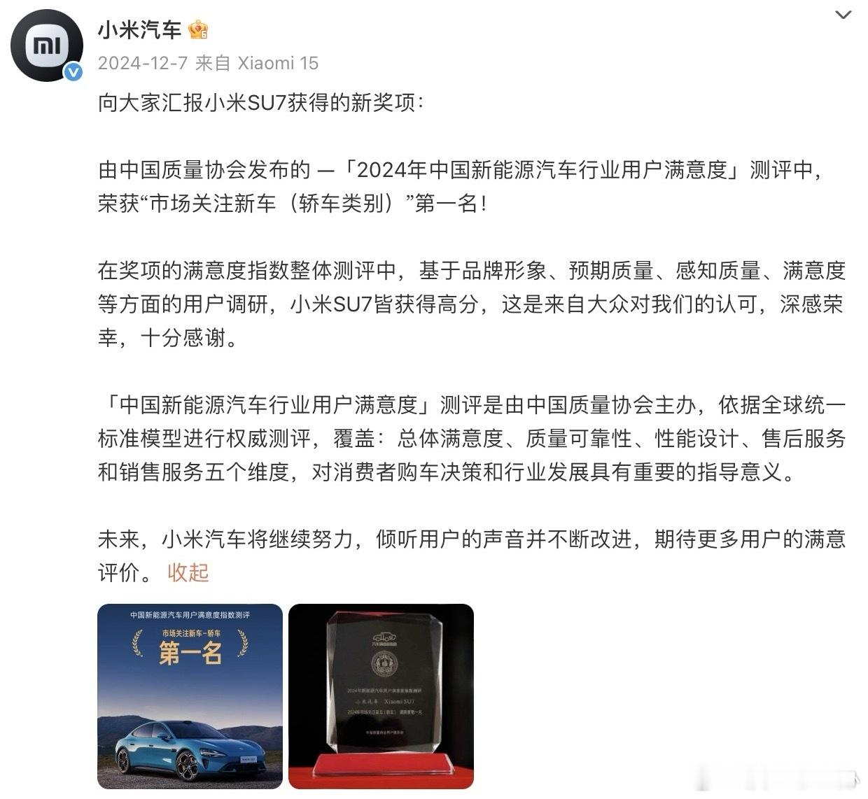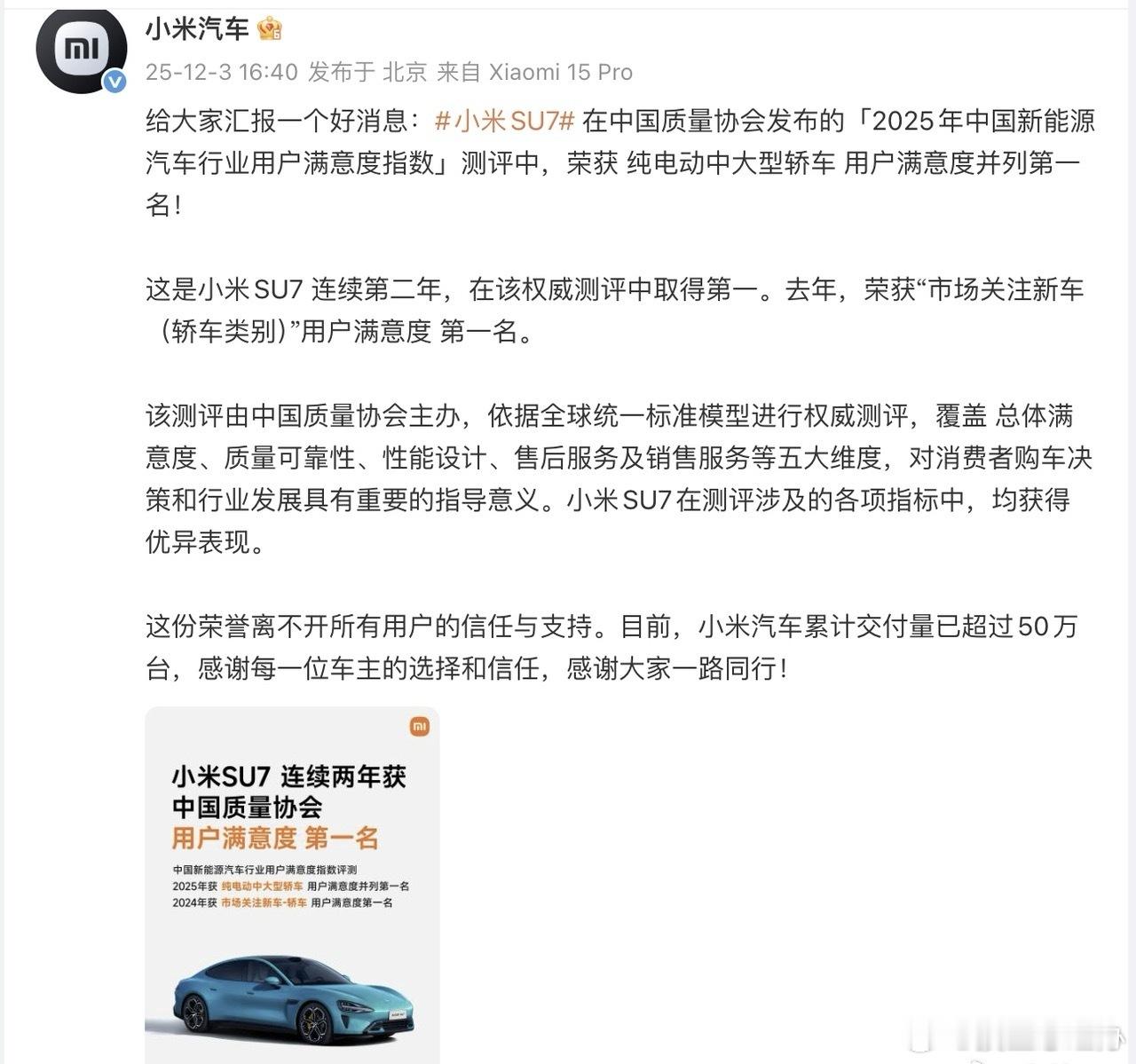 雷军回应小米su7连续两年满意度第一 小米SU7连续两年获得中国质量协会的权威认可, 用户满意度位列第一。传奇耐黑王出一丁点问题都要被放大一百倍,没点可靠性真坚持不到今天。