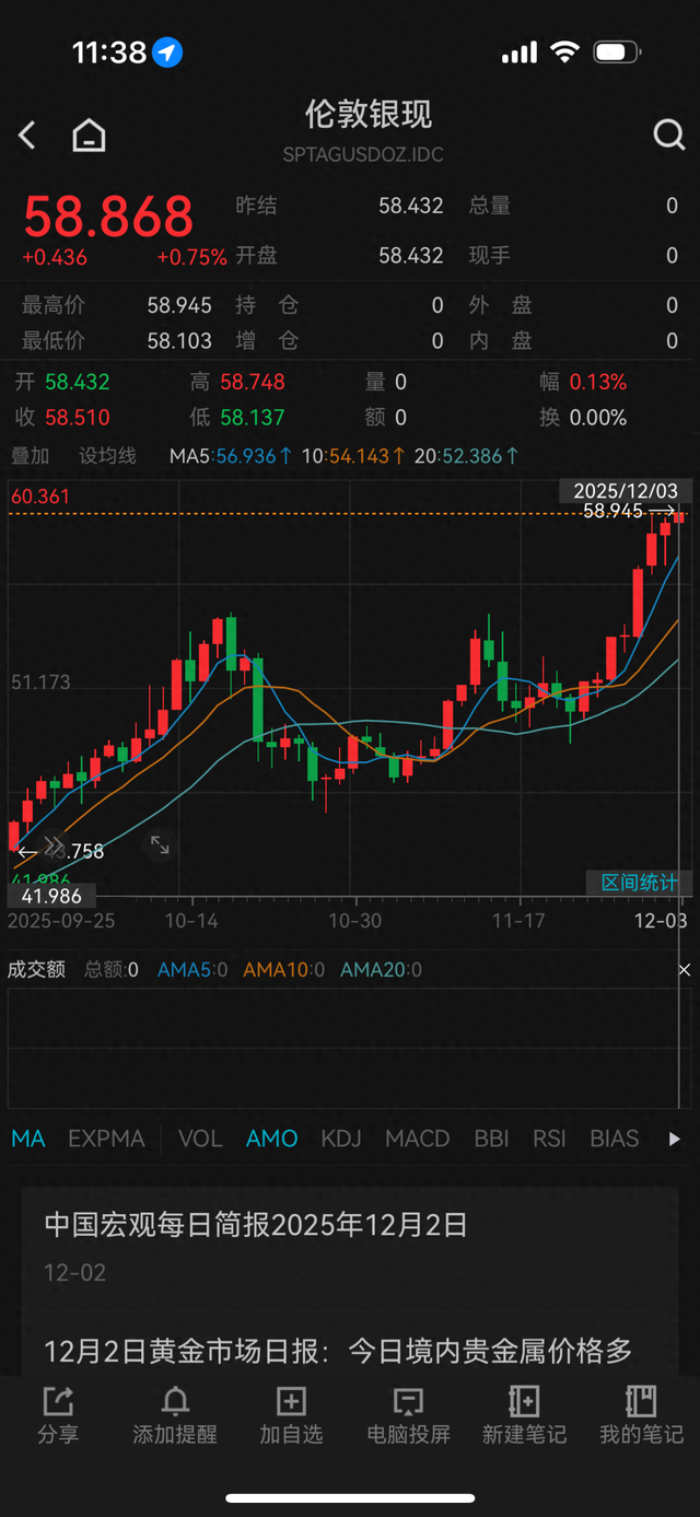 12月3日,现货白银在盘中又创出历史纪录,一度涨至58.945美元/盎司高点。截至发稿时,现货白银上涨0.75%,交投于58.8美元/盎司之上。