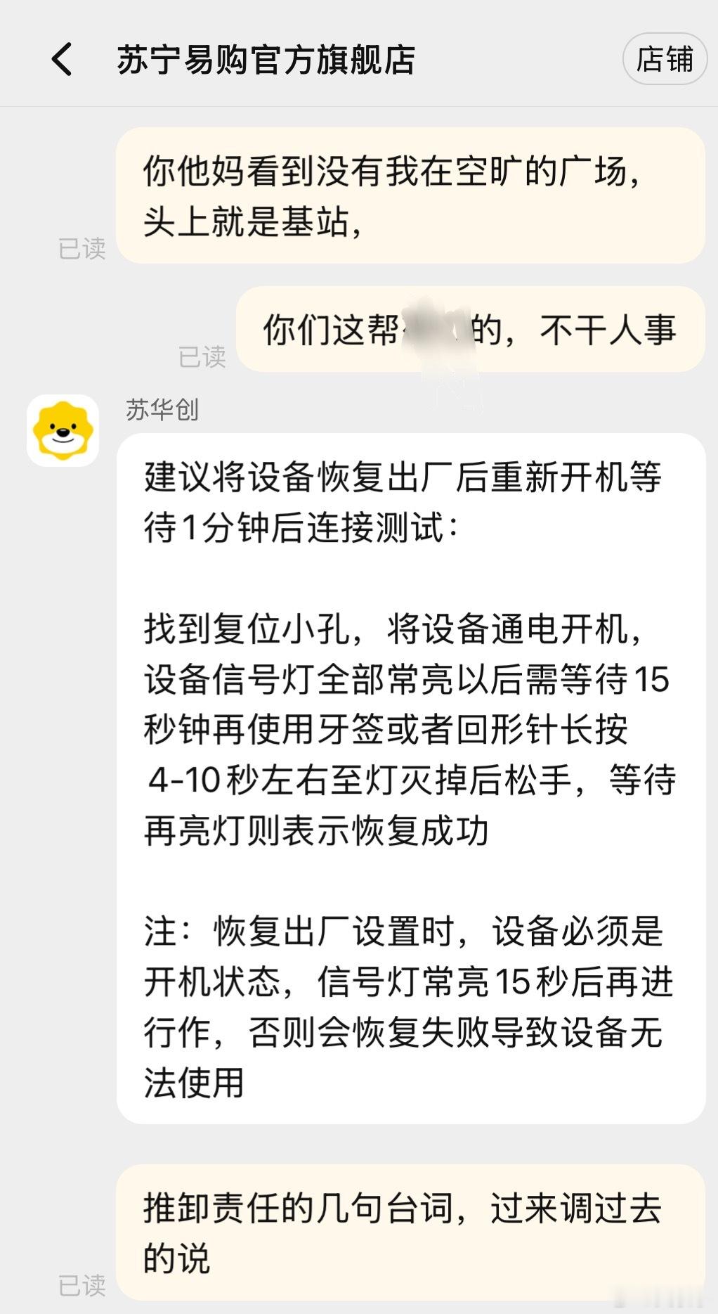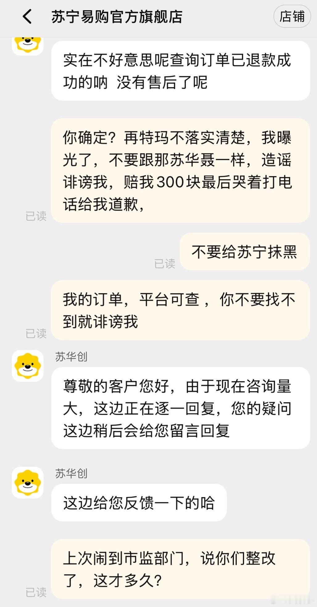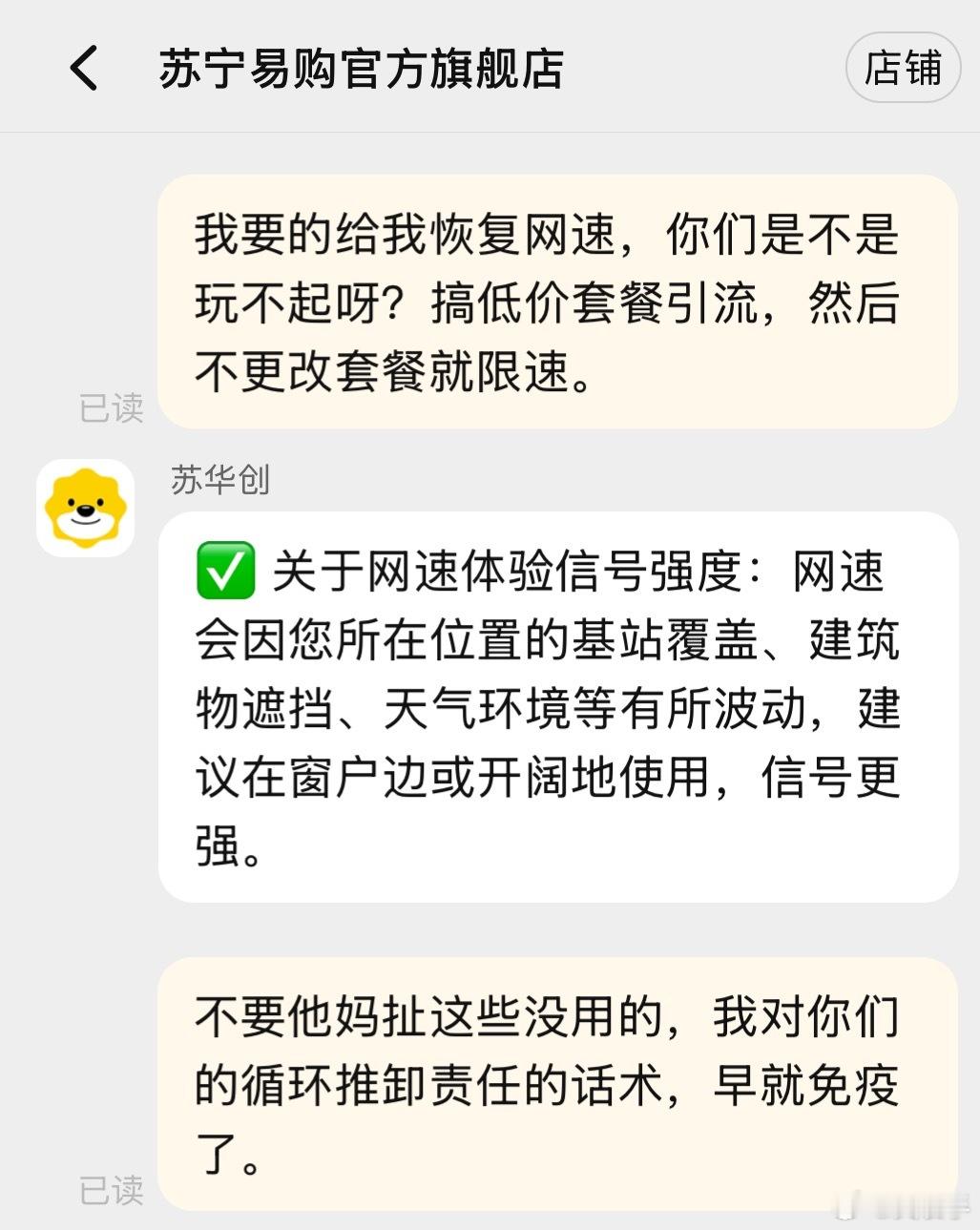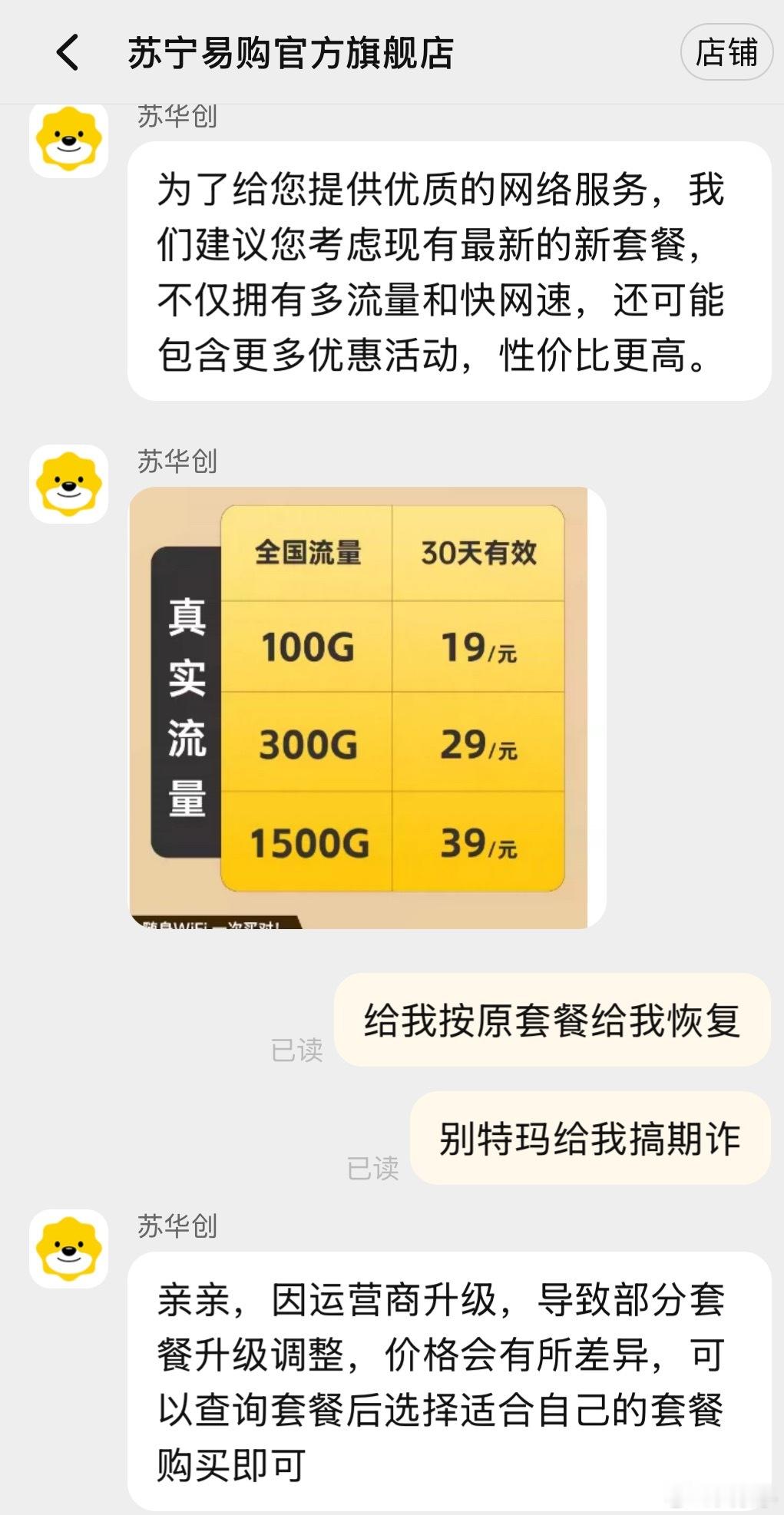 淘宝天猫卖家苏宁易购,卖的随身Wi-Fi售前承诺套餐永不涨价,永不限速 不卡顿。结果私自给我套餐调高,我让他们恢复说一堆冠冕堂皇的话后来我再三强调不给我恢复就投诉举报到工信部和市场监管部门,严重欺诈消费者。后来才心不干甘情不愿的给我恢复。但是又玩缺德的招数给我限速时不时没信号。前几个月被我举报投诉过下架,市场监管部门说他们整改了。我不知道整改的啥?这苏宁易购,我说句不好听的,你们这样没诚信,不倒闭才怪呢。学学胖东来的诚信与售后。自己这件事之后,我再也没去苏宁下过一单。淘宝天猫都被连累,基本在老黄家平台下单。就这种店,你买吧一买一个不吱声。