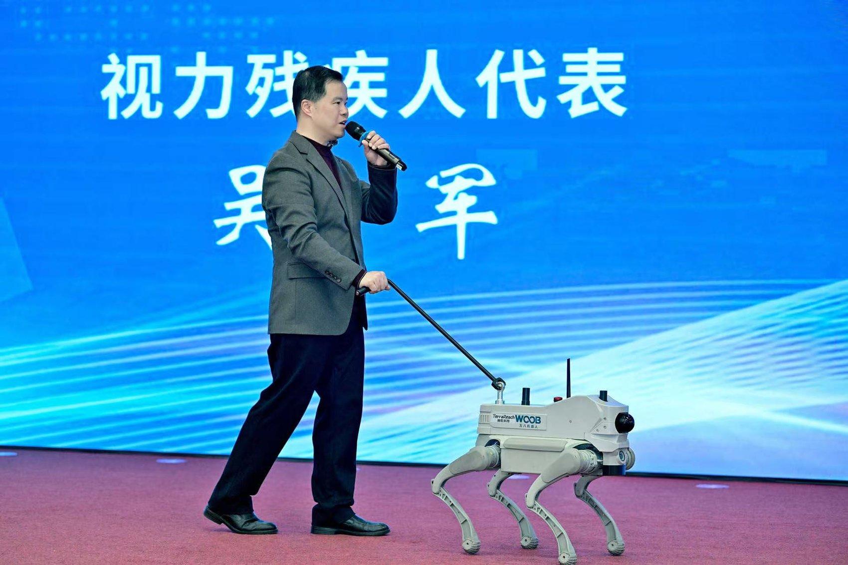 “咔哒咔哒……”在黑暗中穿行40年的盲人吴军,第一次独自走上舞台,为他引路的是一只浑身银白的机器狗“小飞”。12月2日,在四川省2025年国际残疾人日主题活动上,吴军亮出了自己的新身份:“四川造”导盲机器狗试用官。