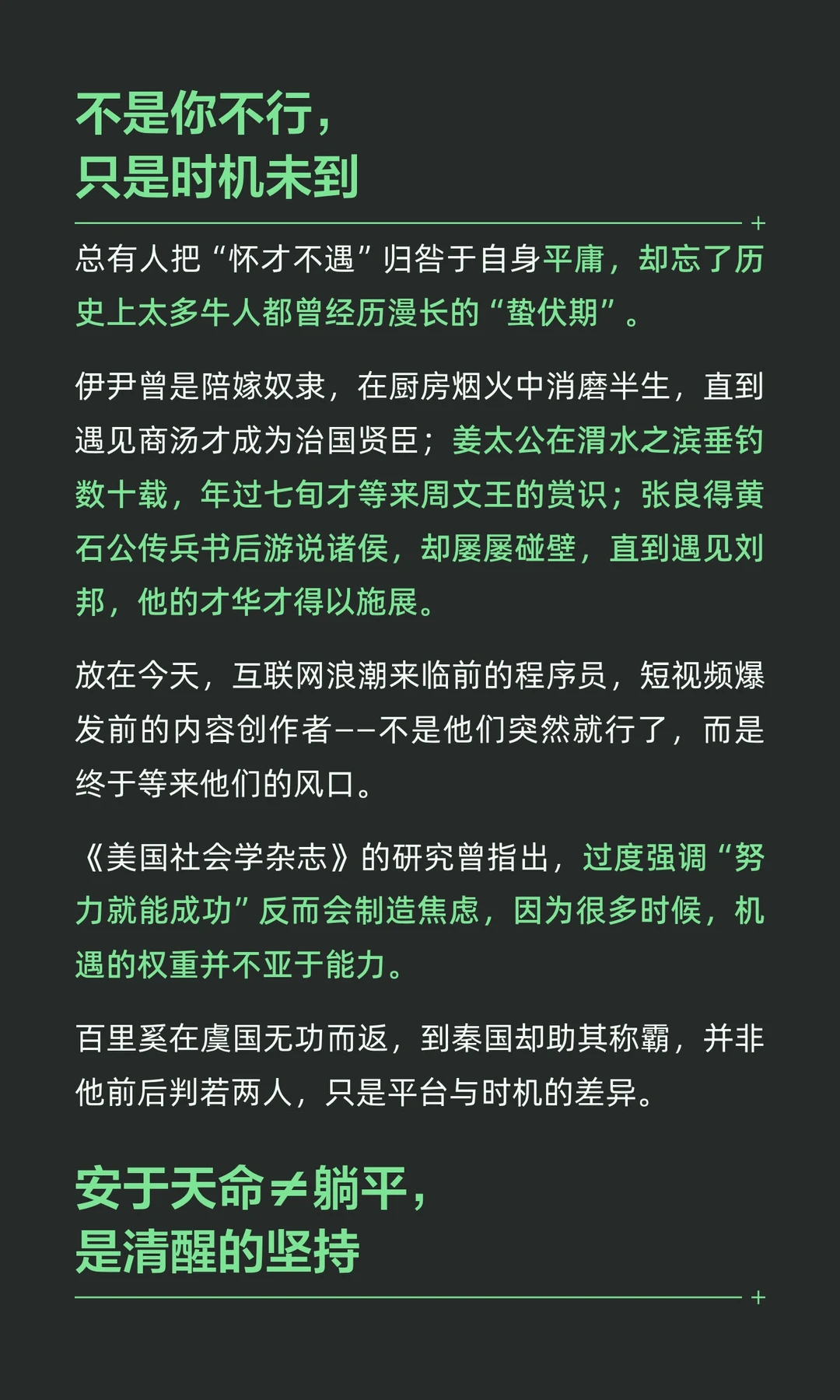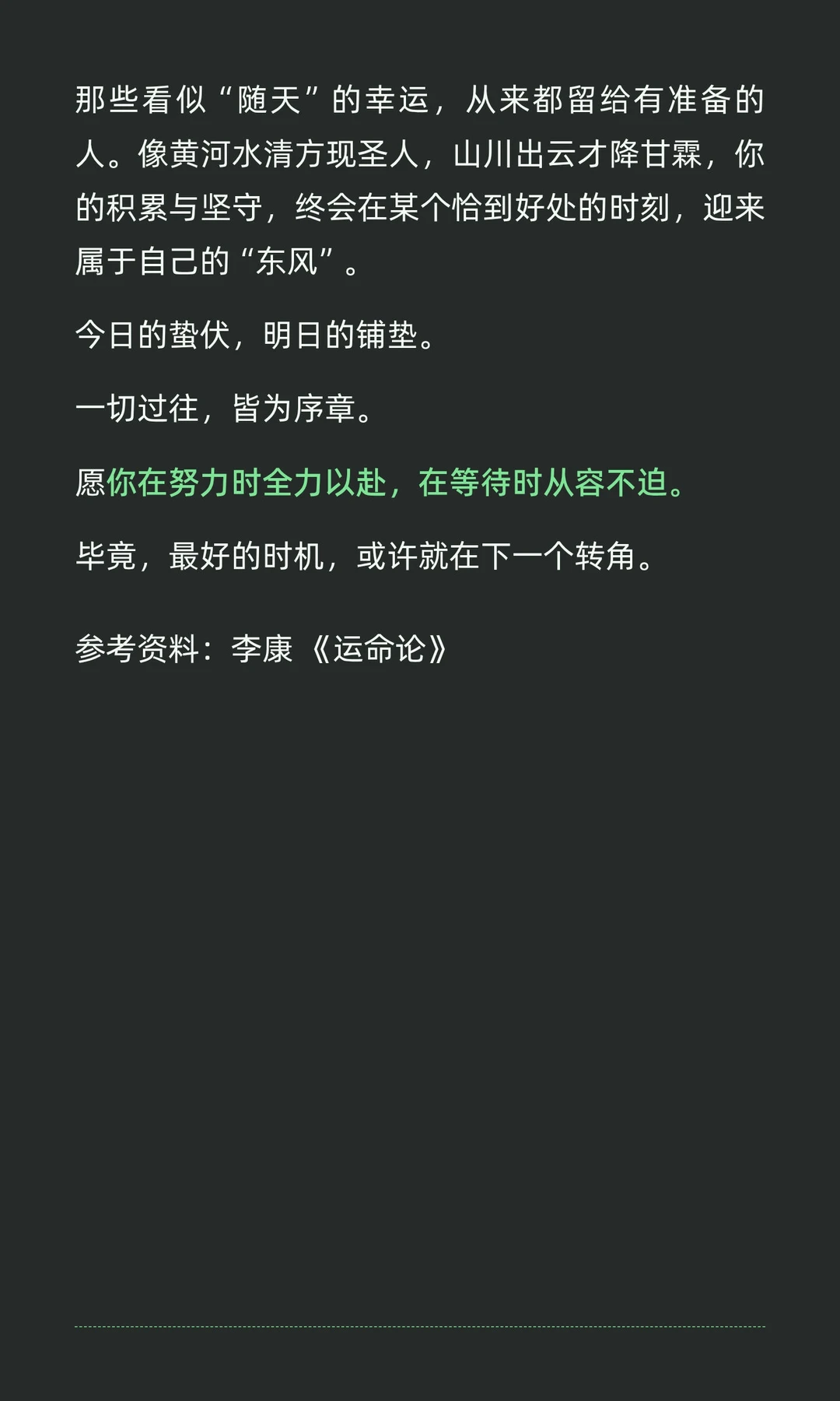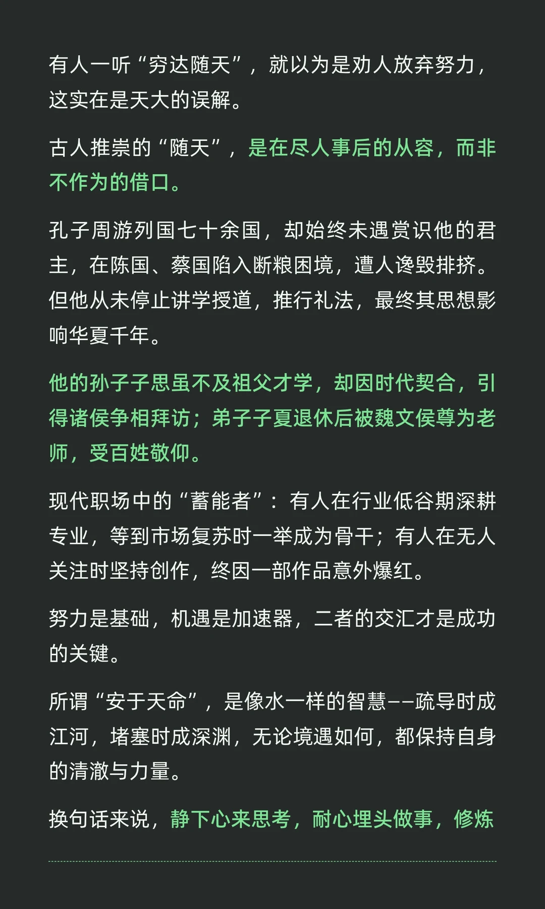 一千多年前,有篇文章早已给出答案:“治乱由命,穷达随天”。这里的“命”与“天”,并非虚无的宿命,而是藏在努力背后的时机、趋势与际遇。它不是教我们躺平,而是帮我们看清:人生的成与败,从来不是“努力”这一个维度能决定的。