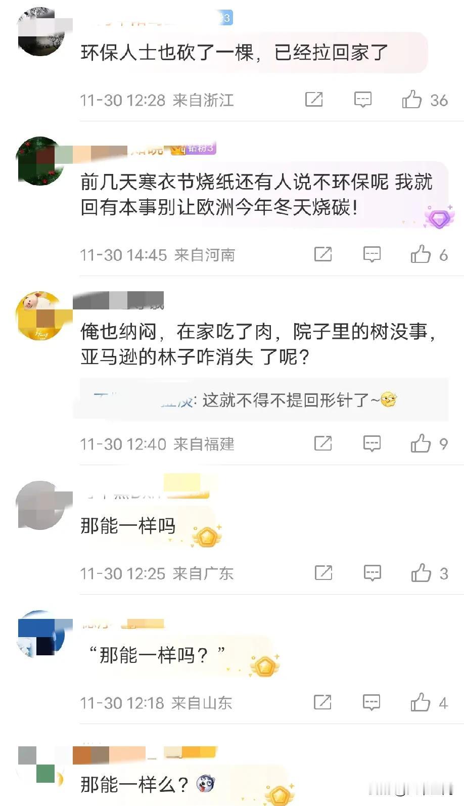 西方人过圣诞节,到处砍树,为没有看到那些环保人士出来反对一声,而中国人好不容易吃肉自由,环保人士就跳出来哇哇乱叫,说我们吃肉会加重气候暖化,然后破坏了亚马逊雨林,还搞一群明星出来宣布吃素和吃人造肉! 欧美现在也不喊减碳了,十年前叫得最凶,目的就是想要限制我们的发展,没想到我们新能源突破了,发展起来了,成为减碳模范生,欧美就不再说什么排碳税,之前它们还想搞排碳税,现在它们连减碳目标都放弃了,美国甚至都退出气候协定了,欧美这样违背减碳承诺,也没有看到哪些环保人士出来说什么!