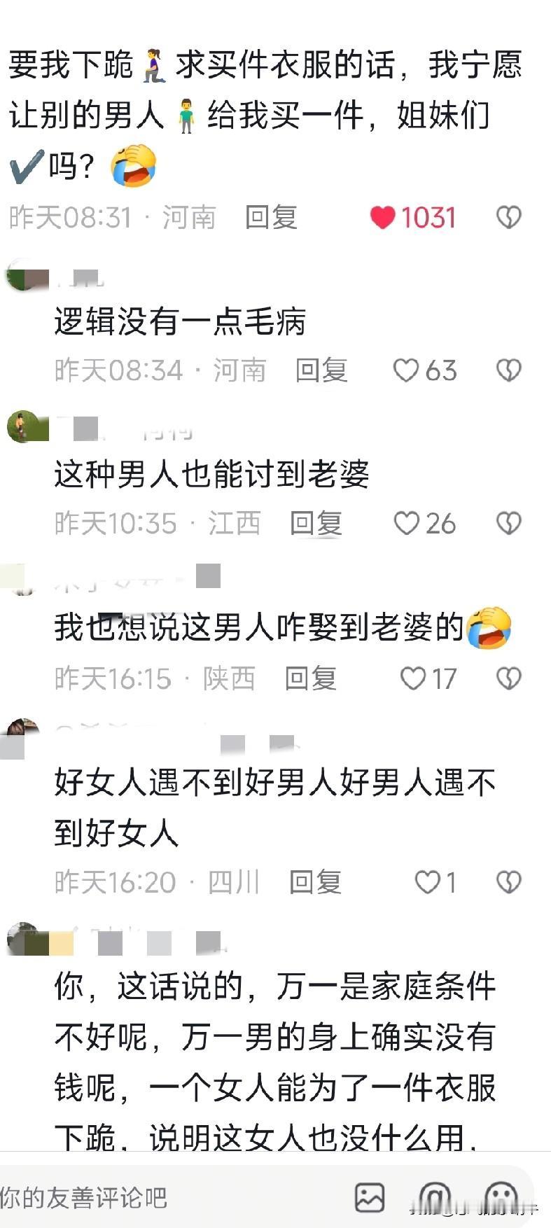如果真是为一件衣服而这个样子,那只能说,越长的歪瓜裂枣的男人越差劲越没本事,越歪瓜裂枣的女人也越差劲越厚颜无耻!两个差劲的遇到一起了!主打一个没脸没皮! ​一个没钱买或者不给买,无能➕自私自利➕不会哄老婆!一个为了一件衣服下跪,不要尊严不要脸!真是一对现世宝!!! ​评论区还那么多同情女人的,说实话有些女人真不值得同情!家里啥情况不知道吗?一件衣服299也许是一个星期的生活费了,买个几十块的不能穿吗?就打扮成这个样子,买个能力范围内的拉倒,还下跪!跪什么跪?软骨头!好手好脚自己去打临时工都能买得起了!还跪个锤子🔨,那么多人看着就为了一件衣服下跪,实在丢人!! 做人就应该活的有尊严,勤快一点,何必这个样子呢?让人不齿!