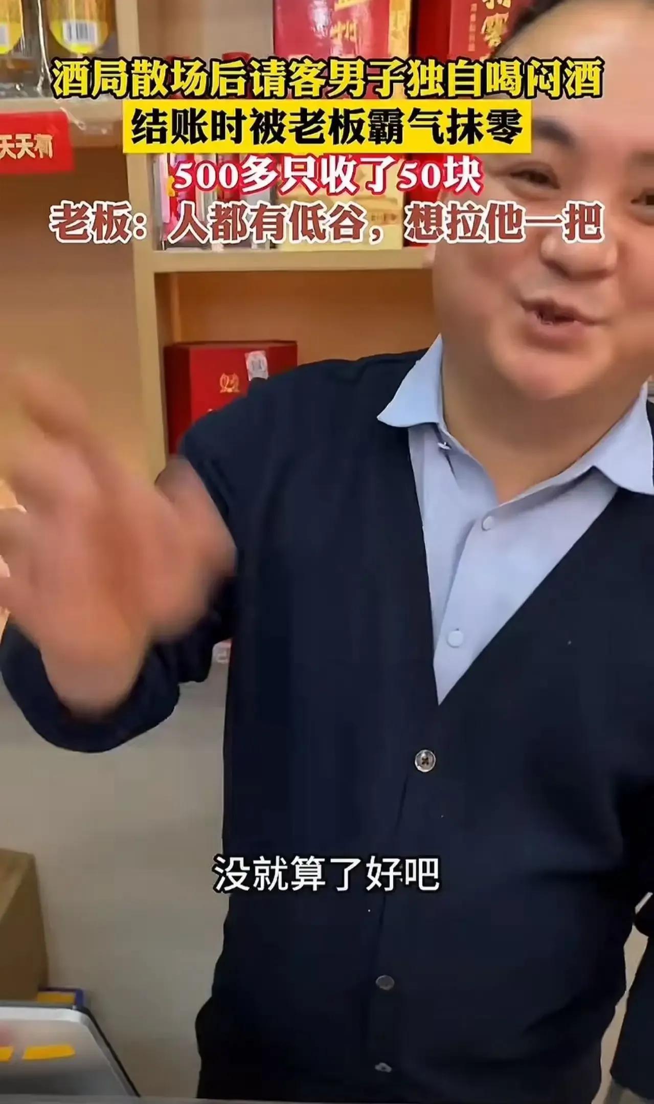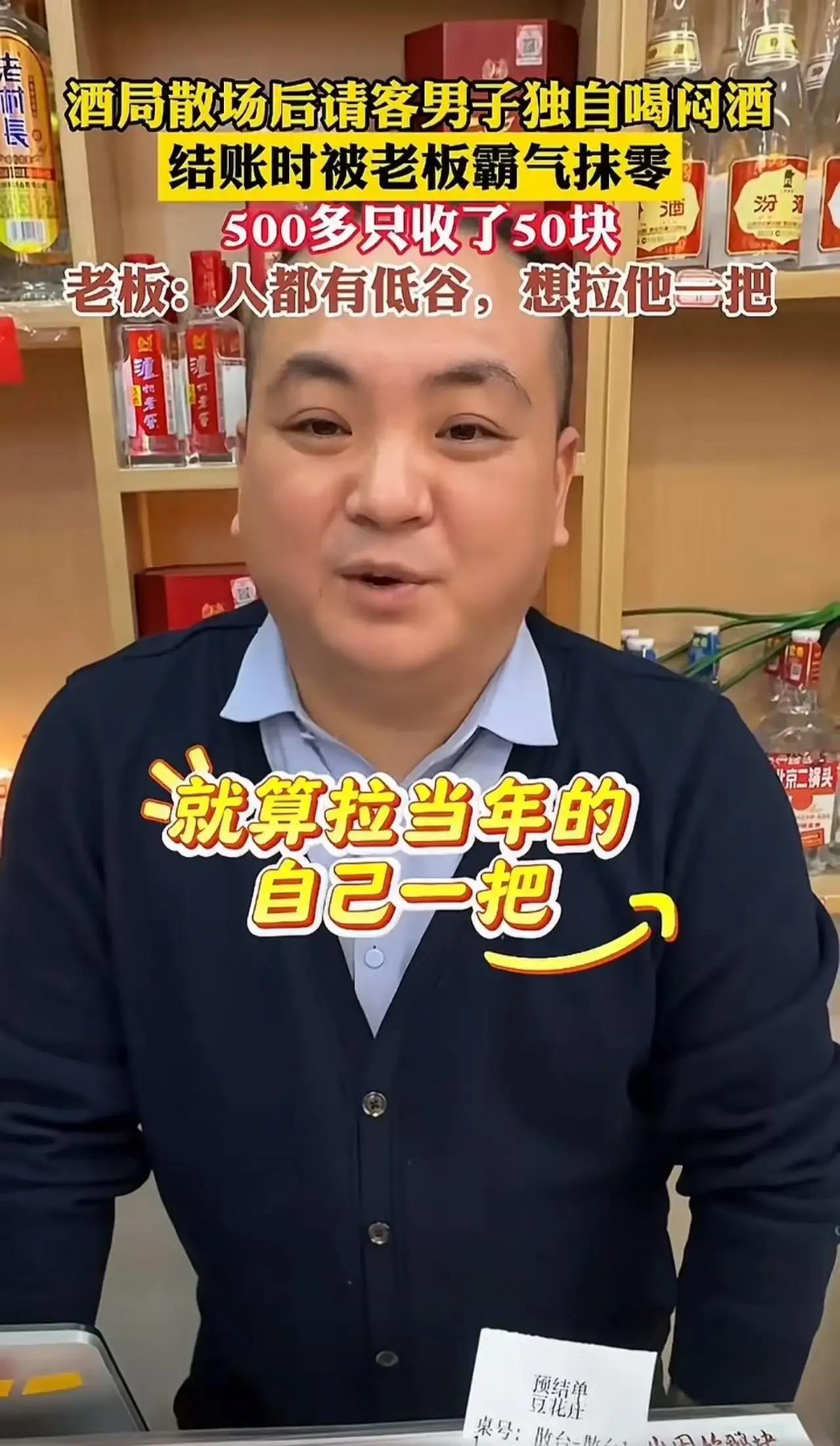 男子请朋友喝酒,本想借机要回当初借出去的钱,没想到朋友一听要钱,竟然直接开溜!留下男子一人独自喝闷酒,这尴尬又心酸的场面,接下来却发生了意想不到的转折! 男子小刚,原本想借着请朋友喝酒的机会,把之前借出去的钱要回来。可谁曾想,朋友一听要还钱,脸色一变,找了个借口就匆匆离开了。小刚坐在空荡荡的酒桌前,心里五味杂陈,只能一杯接一杯地喝着闷酒。这时,饭店老板注意到了小刚的异样,走过来询问情况。得知小刚的遭遇后,老板不仅没有嘲笑他,反而拍了拍他的肩膀,语重心长地说:“兄弟,刚才我都看到了,你的钱要不回来。其实两三年前,我还不如你呢,那时候我也经历过低谷,知道这种滋味不好受。你给56就行了,剩下的就当是我请你喝的。”说完,老板霸气地抹去了500多块钱的零头,只收了小刚56块钱。 老板的举动真是太暖心了,不仅让小刚感受到了人间的温情,也让我们看到了善良的力量。如果你也被老板的举动感动了,那就快来评论区留下你的看法吧,一起为这份善良点赞!请朋友喝酒 请人喝酒