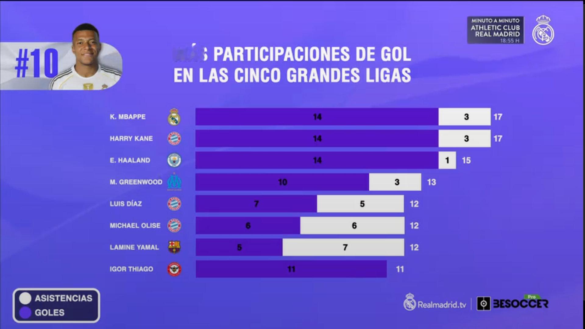 【皇马TV】姆巴佩迎来职业生涯最佳开局赛季。目前19场进23球,并且在五大联赛参与进球最多,并且也是他自然年进球最多的一年。