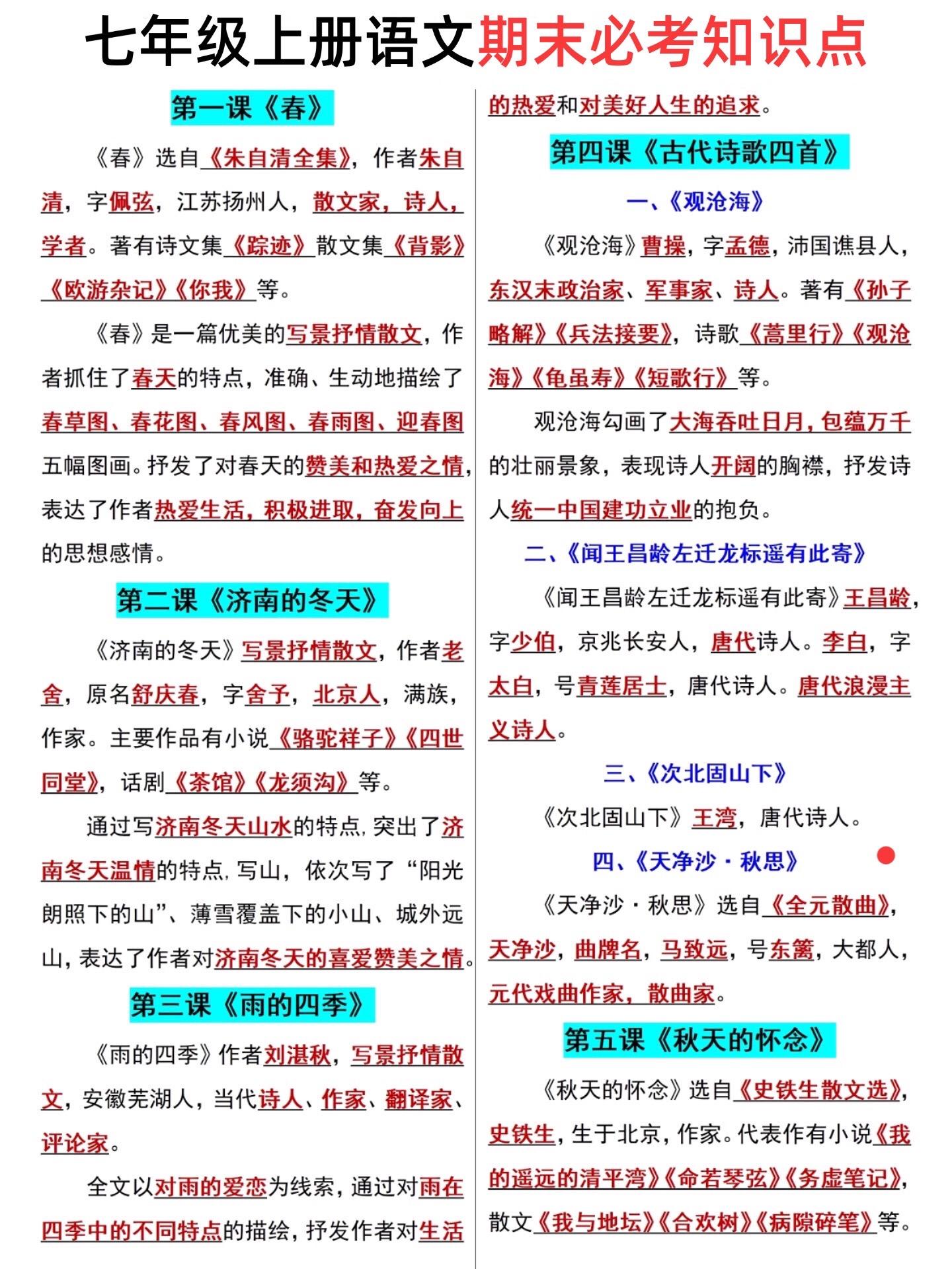 七年级上册期末总复习必背重点知识汇总。七年级上册各科必背重点,老师给大家整理出来了。这份资料能帮助孩子更好的掌握课文知识,家长快给孩子打印一份出来学习吧