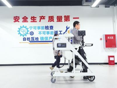 工厂内,工人正在对外骨骼机器人进行测评、调试。