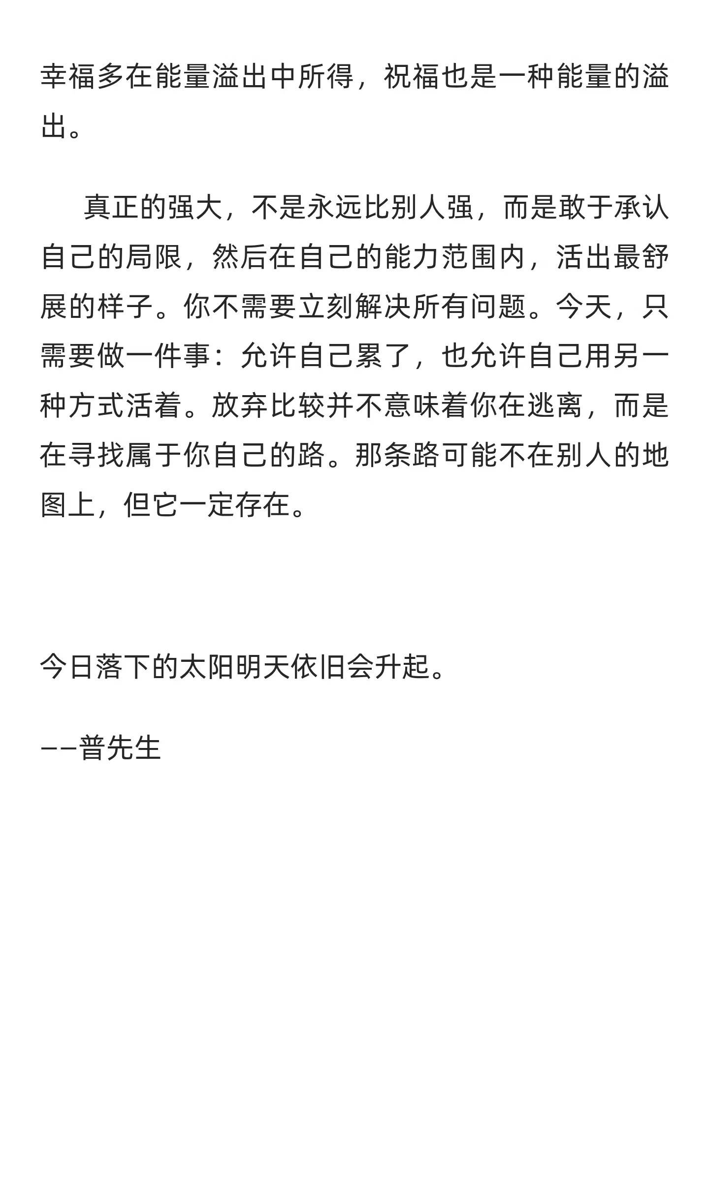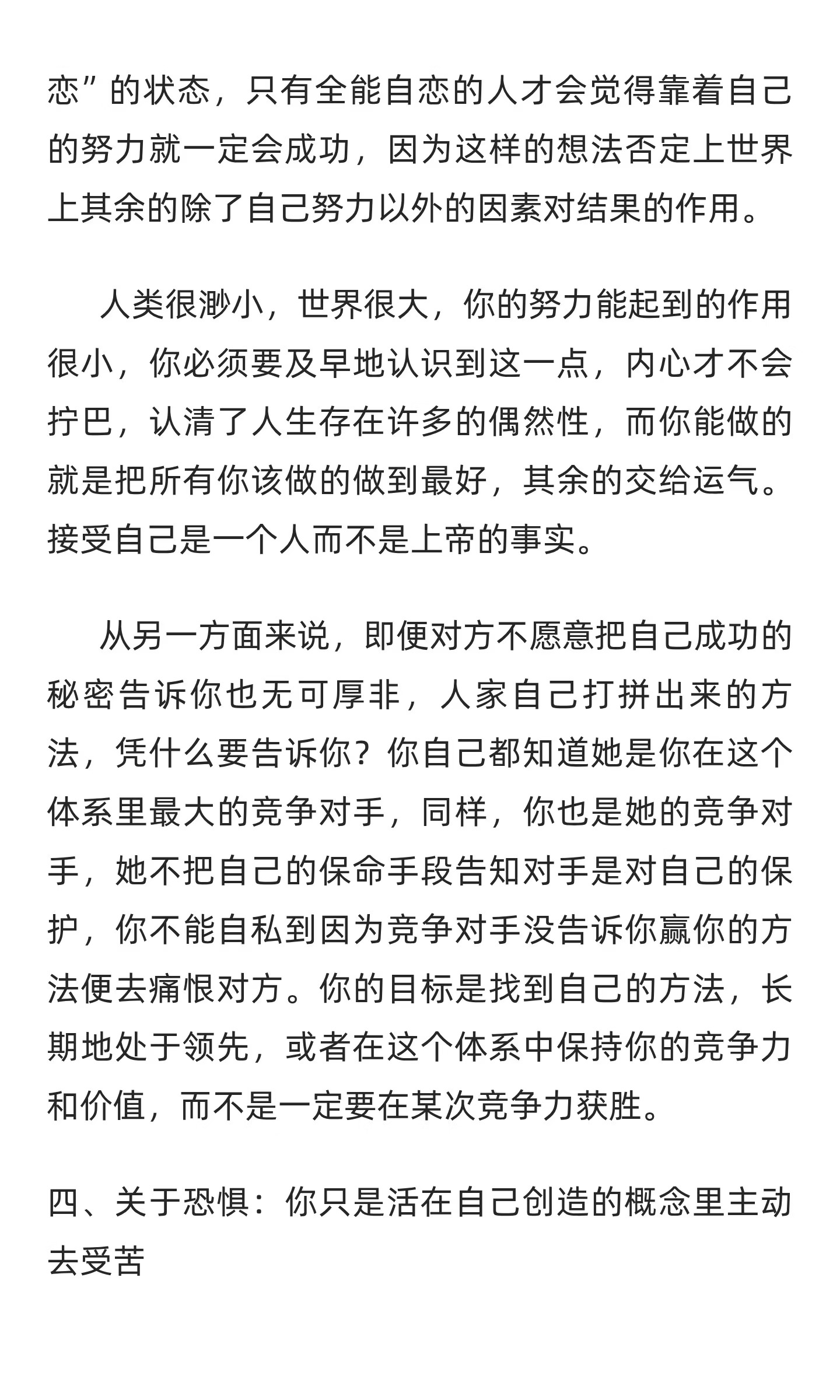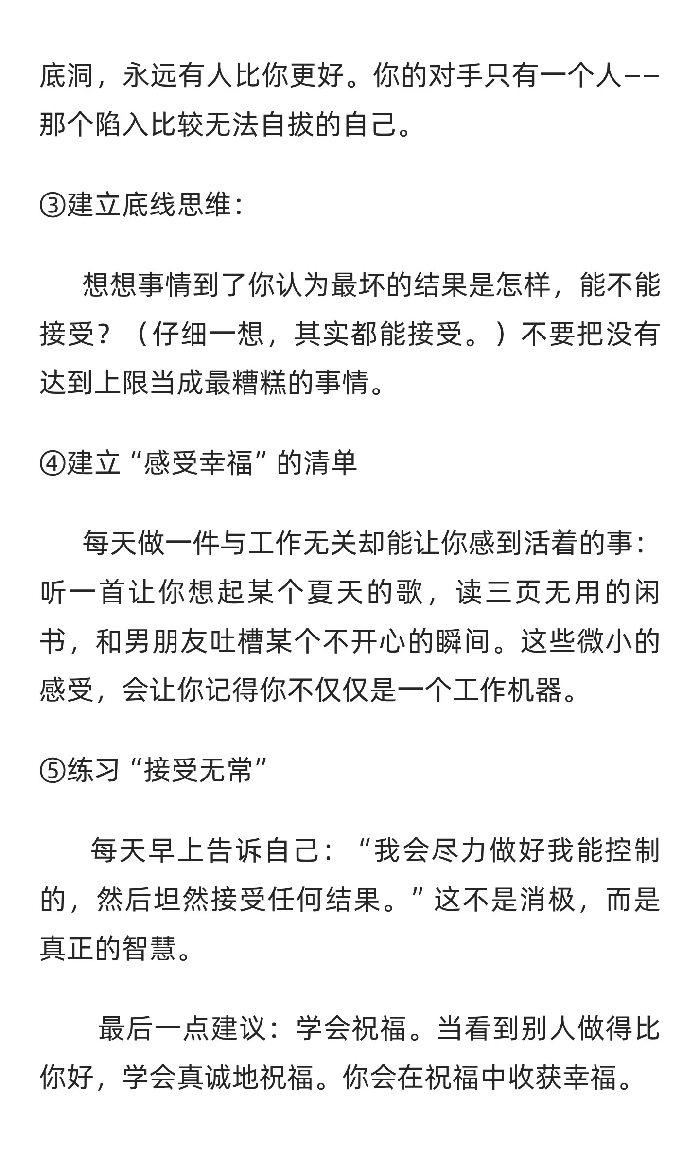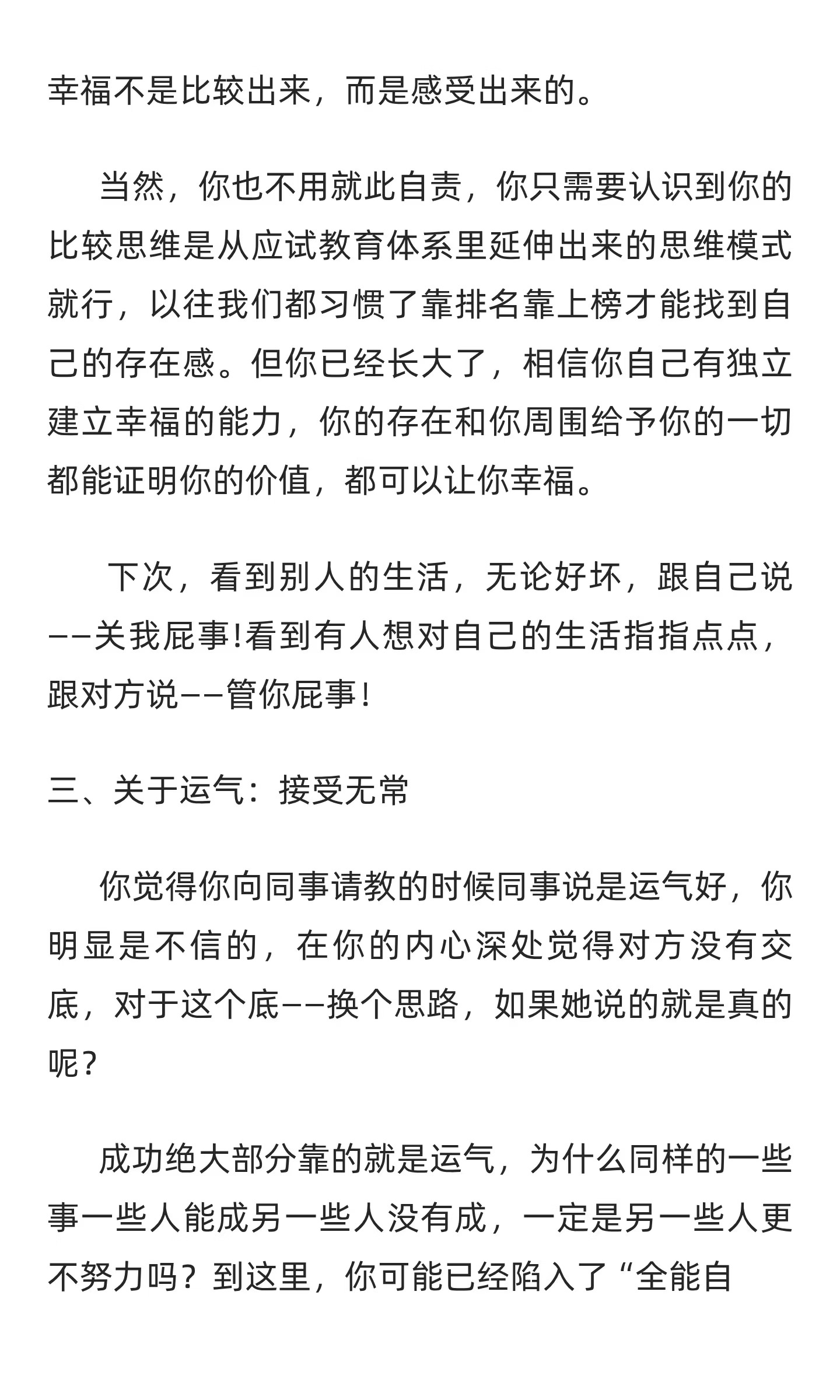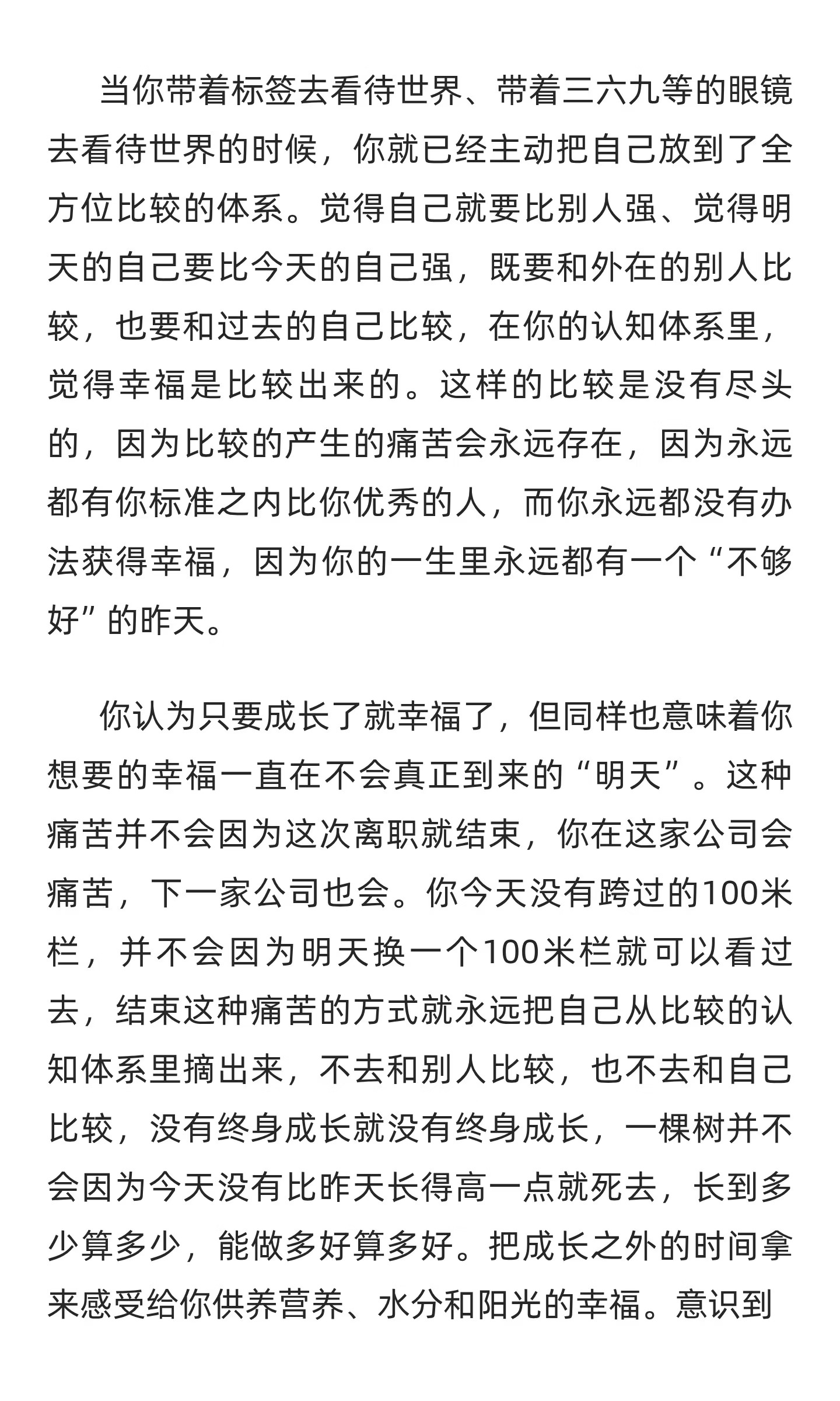 当你带着标签去看待世界、带着三六九等的眼镜去看待世界的时候,你就已经主动把自己放到了全方位比较的体系。觉得自己就要比别人强、觉得明天的自己要比今天的自己强,既要和外在的别人比较,也要和过去的自己比较,在你的认知体系里,觉得幸福是比较出来的。这样的比较是没有尽头的,因为比较的产生的痛苦会永远存在,因为永远都有你标准之内比你优秀的人,而你永远都没有办法获得幸福,因为你的一生里永远都有一个“不够好”的昨天。