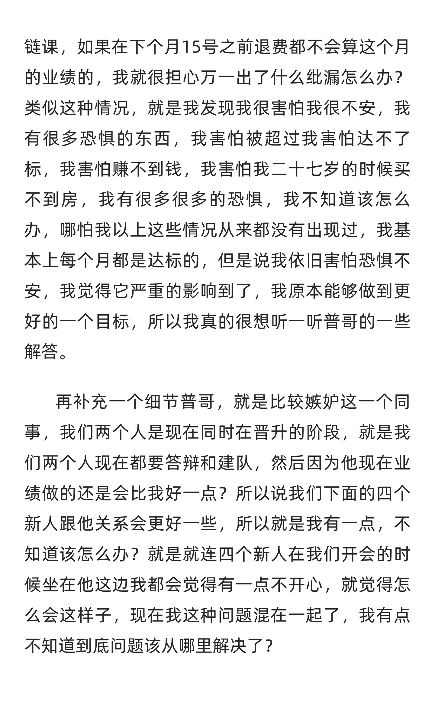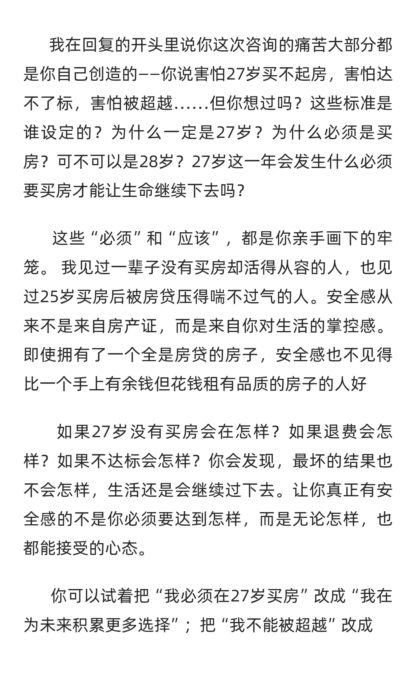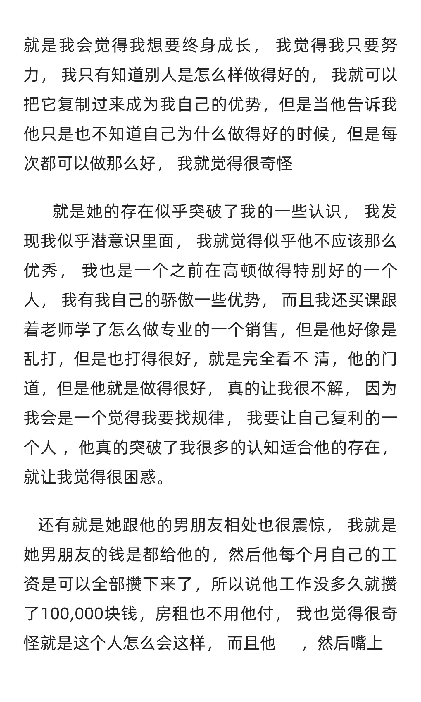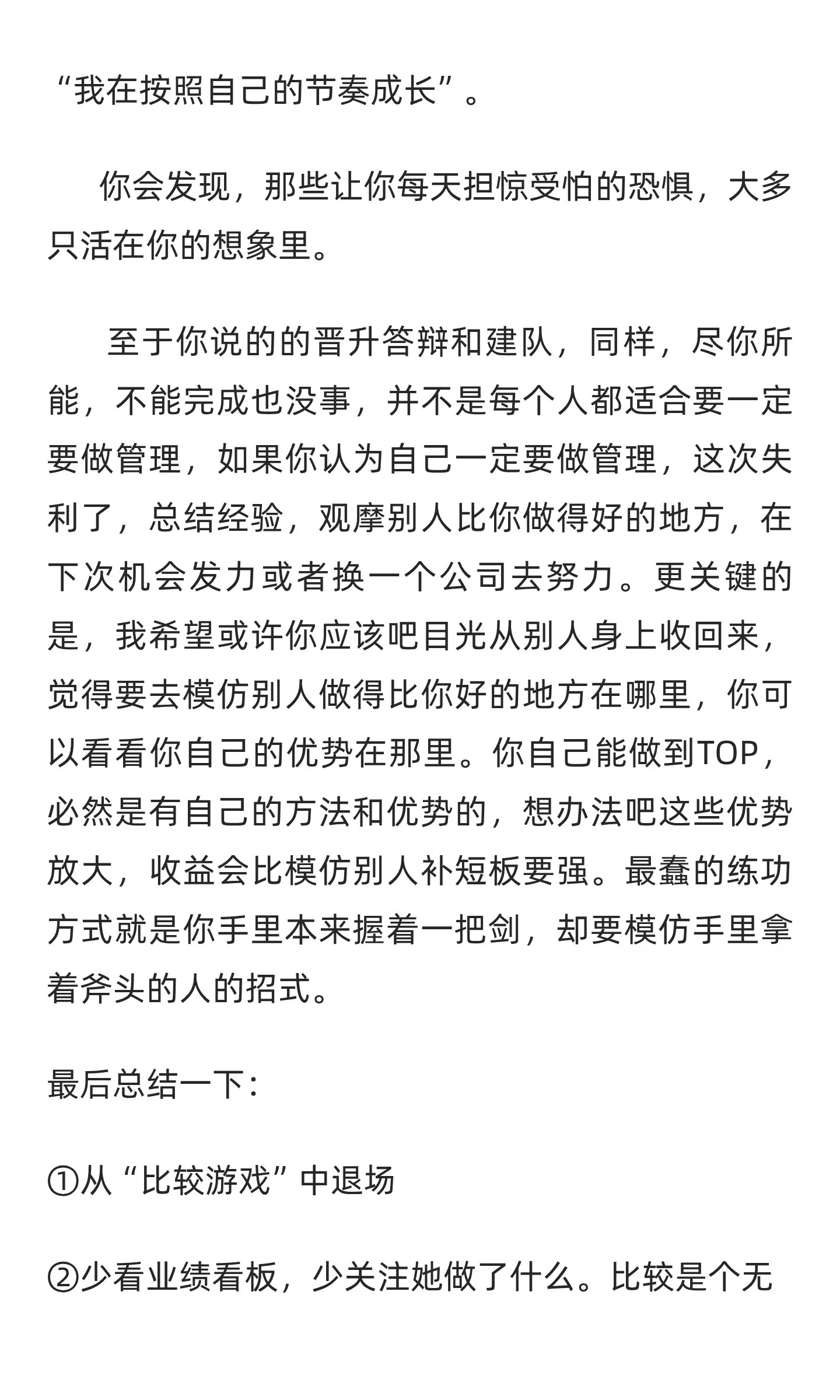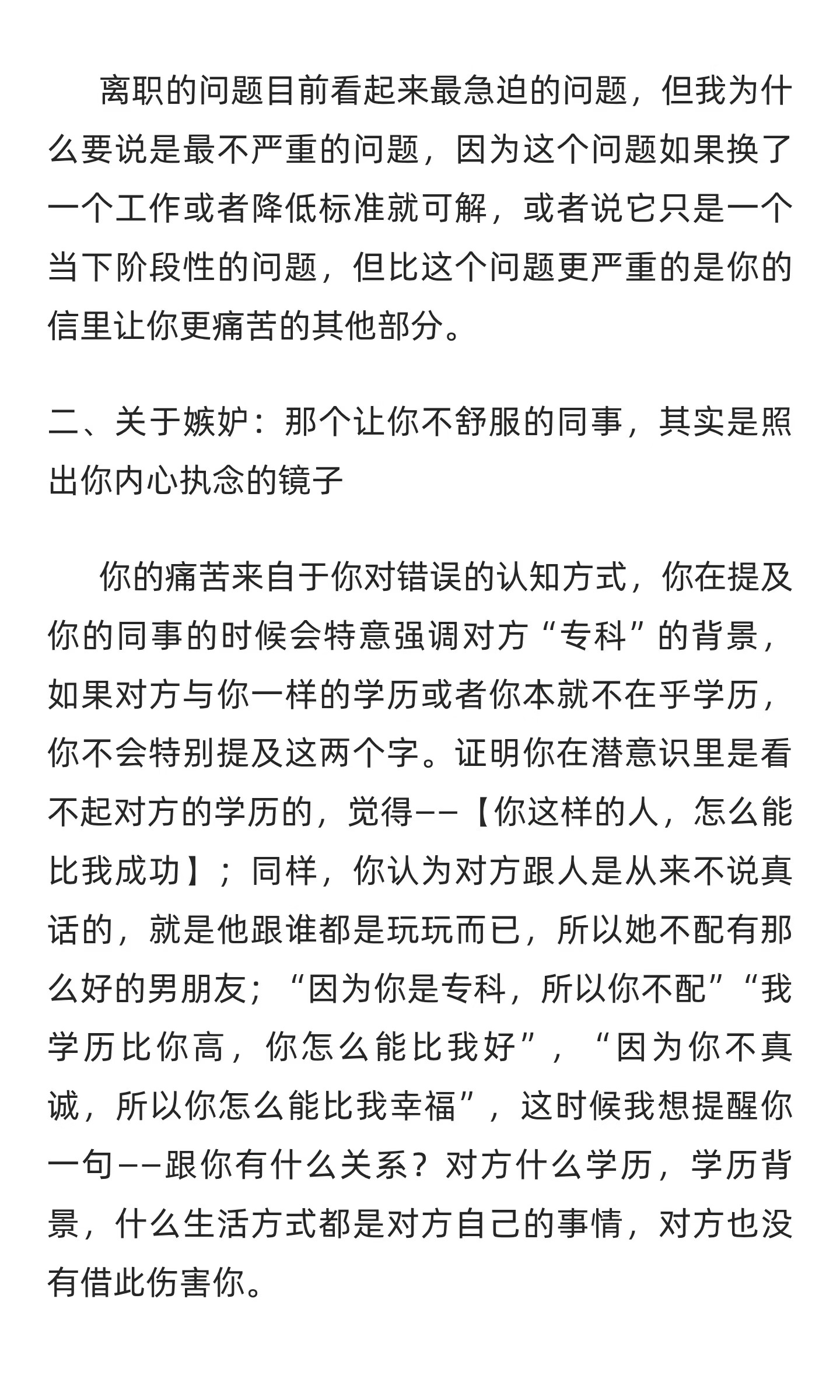 当你带着标签去看待世界、带着三六九等的眼镜去看待世界的时候,你就已经主动把自己放到了全方位比较的体系。觉得自己就要比别人强、觉得明天的自己要比今天的自己强,既要和外在的别人比较,也要和过去的自己比较,在你的认知体系里,觉得幸福是比较出来的。这样的比较是没有尽头的,因为比较的产生的痛苦会永远存在,因为永远都有你标准之内比你优秀的人,而你永远都没有办法获得幸福,因为你的一生里永远都有一个“不够好”的昨天。