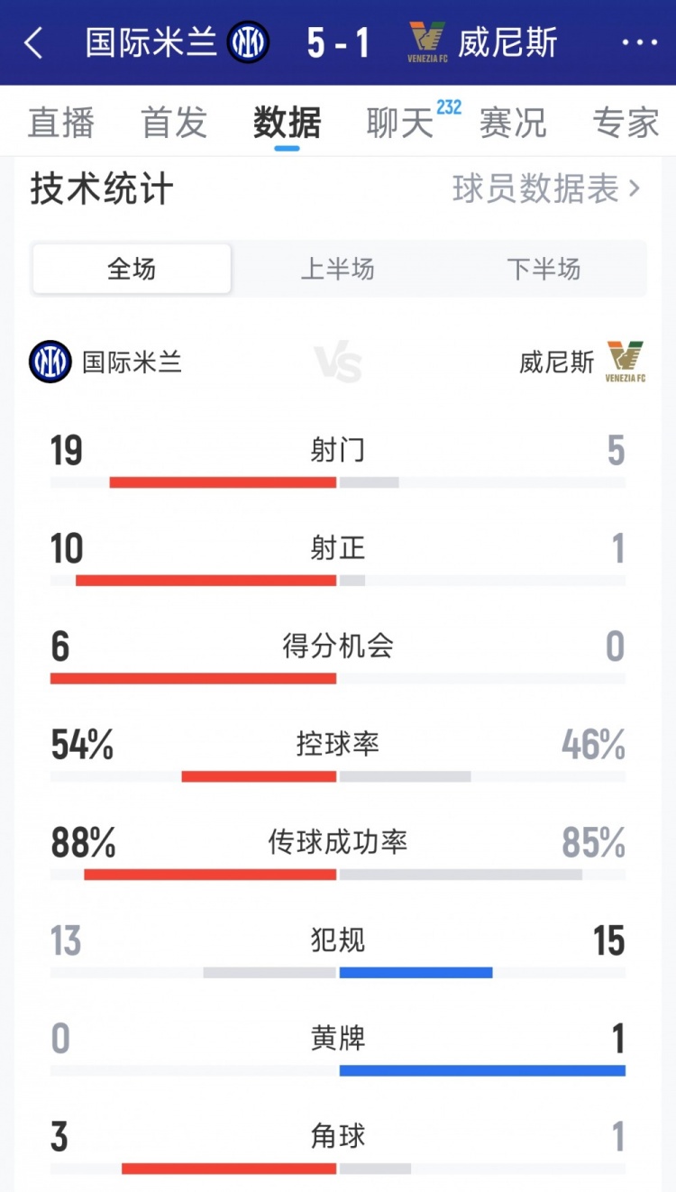 直播吧12月4日讯在本轮意大利杯,国米5-1大胜威尼斯,以下为双方全场数据对比: