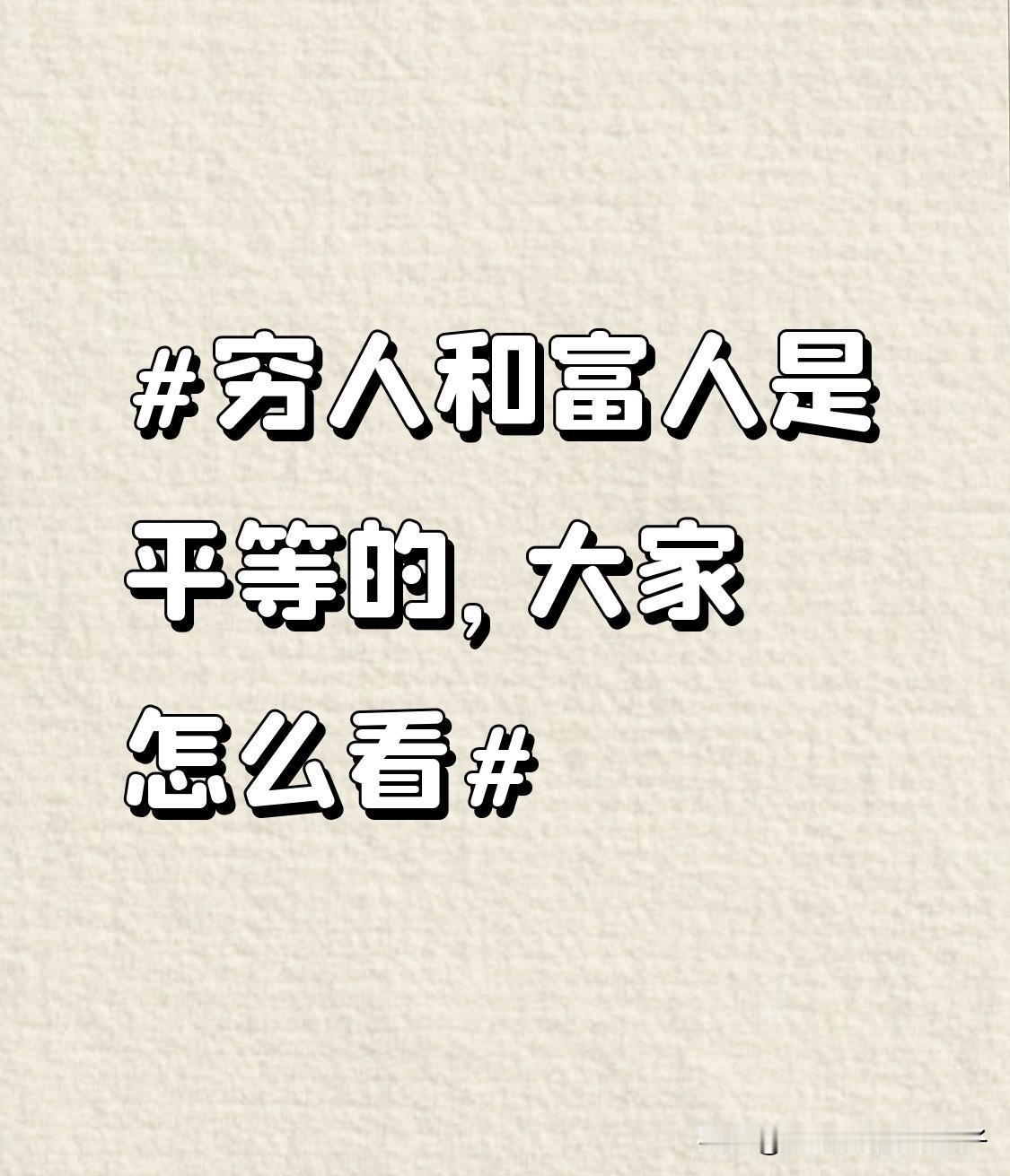 说穷人和富人平等,这得从不同角度看。从某些方面讲,大家都活在世上,呼吸同样的空气,享受同样的阳光,都有喜怒哀乐,肩上都担着责任,身体都会疲惫,没有谁能永葆青春,这时候穷富没啥高低之分。 但现实里,贫富差距让平等成了奢望。出身不同,消费和价值观就不同,穷富家庭的孩子相爱,往往也难走到最后。而且很多富人从内心就不想和穷人多来往。富人有财富积累和独特思维方式,也会选择和更富的人相处。所以,说平等有点理想化,不过品行修养上,穷富都得有底线。