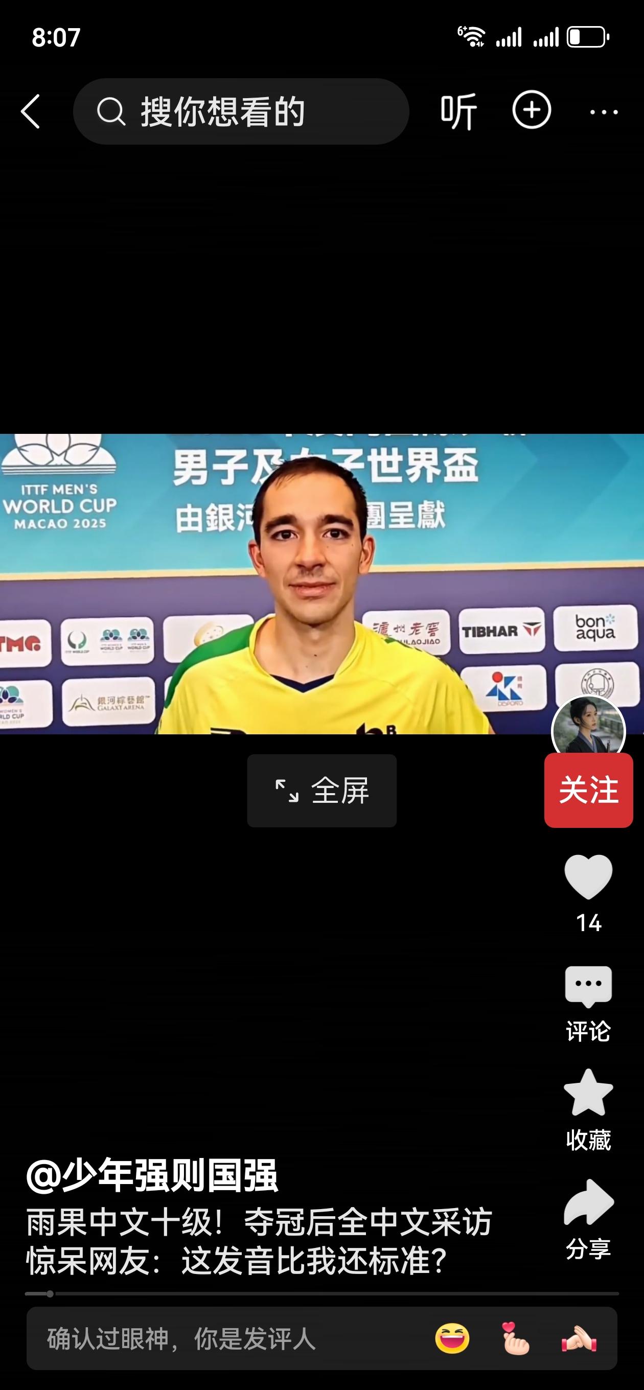 如果说巴西乒乓球运动员雨果中文说得很溜,那是你还没听过法国乒乓球运动员西蒙·高茨讲中文。那水平,若西蒙排第二,没人敢称第一。 第一次听他在成都混团世界杯接受记者采访,全程用国语交流,流利程度与土生土长的中国人无异。并且他逻辑思维清晰,阐述观点条理分明,让人难以分辨他是否接受过专业的中文教育。 真佩服西蒙,球打得好,中文还说得这么棒。看来,掌握一门技艺,仅练好技术不够,还得熟练掌握该国语言。