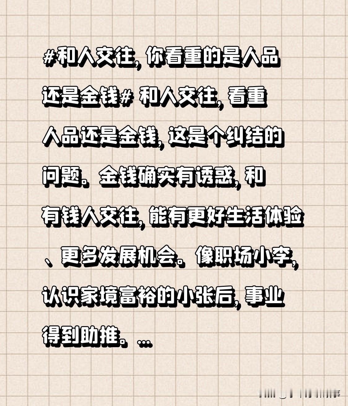 和人交往,看重人品还是金钱,着实是个令人纠结的问题。金钱颇具诱惑,与有钱人交往,能有更优生活体验、更多发展机遇。如职场小李,结识家境优渥的小张后,事业获助推。调查显示,约30%的人认为对方经济实力至关重要。 但我更看重人品。金钱无底线,人品才是保障。我见过金融圈一些富有的人,虽抢着买单,却未必靠谱。生意失败时,有人催债,有人借钱,信誉远比金钱重要。与品行不端者交往,迟早会被坑,人品才是交往的稳固基石。