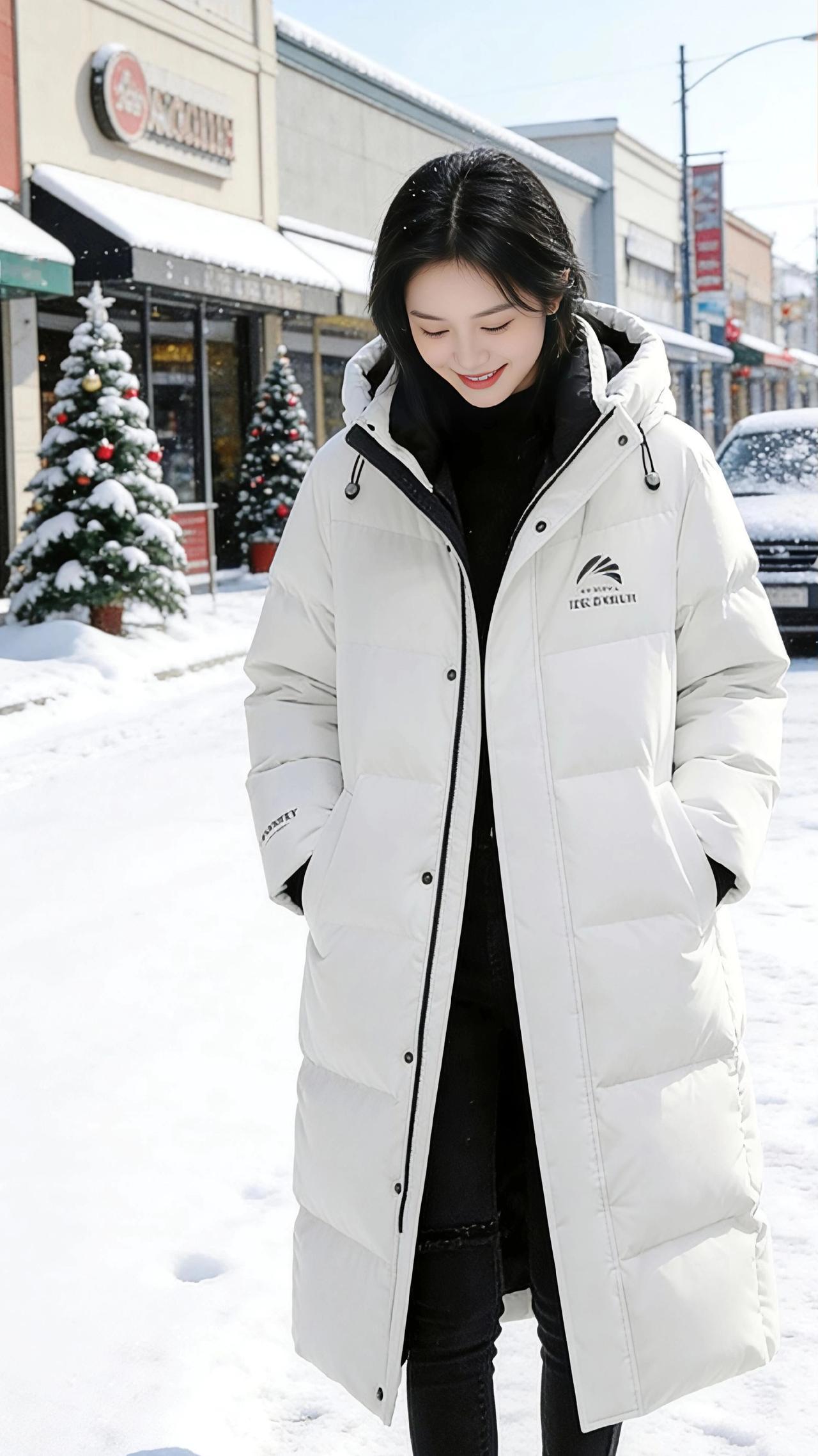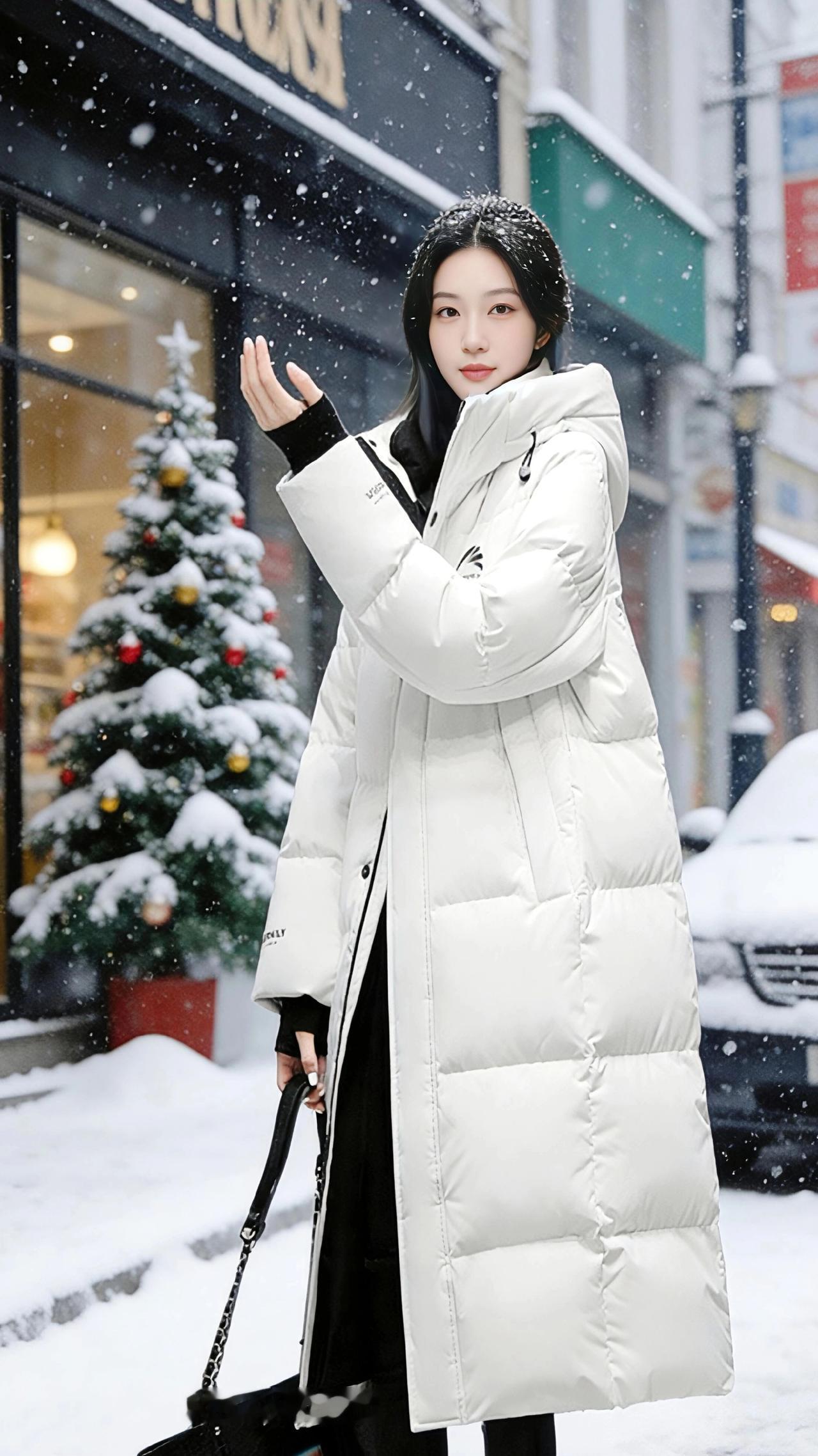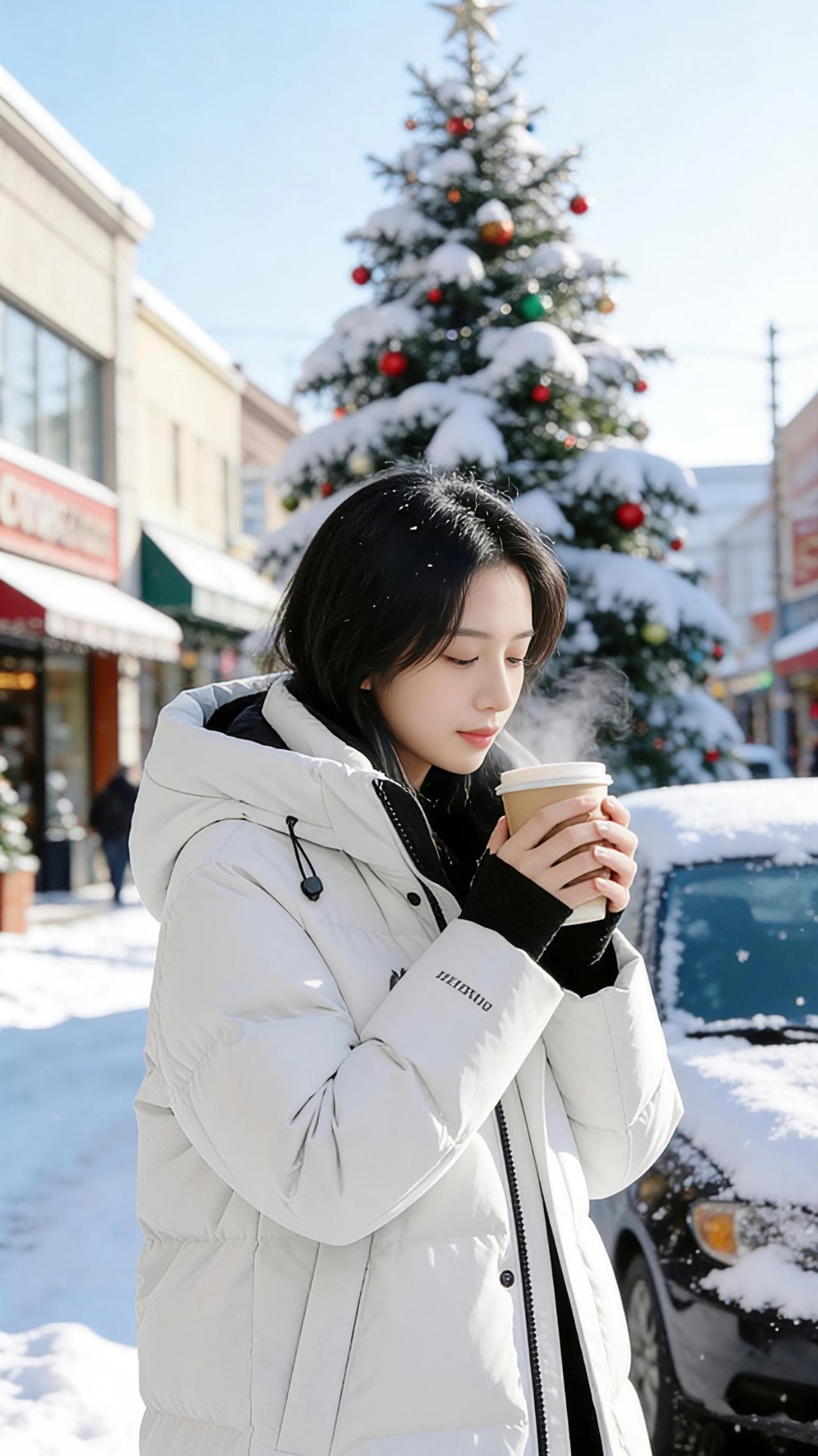 雪落时,整条街都浸在绒绒的白里。她裹着米白长袄立在巷口,衣摆垂到脚踝,像裹了团温软的云——袖口那行“HEIBIRD”的针脚,在雪光里泛着细弱的光,是冬的暗纹。 圣诞树顶的星子落了雪,红球球裹着白边,像糖霜沾了浆果。她抬手接雪,指缝漏下的碎白,混着街旁咖啡馆的热雾,在风里飘成轻烟。偶尔蹭过落雪的车盖,衣料擦过冰面的轻响,比圣诞铃更软。 风裹着雪粒子扫过发梢,她把下巴埋进领口,连呼吸都浸着冷香。身后店铺的灯牌半掩在雪幕里,暖黄的光揉碎在她睫毛上,落成星星点点的亮。这冬不是冷的,是裹在软袄里的、带着咖啡热气的,静悄悄的甜。 高级感穿搭 小个子穿搭 棉服大衣 冬季穿搭
