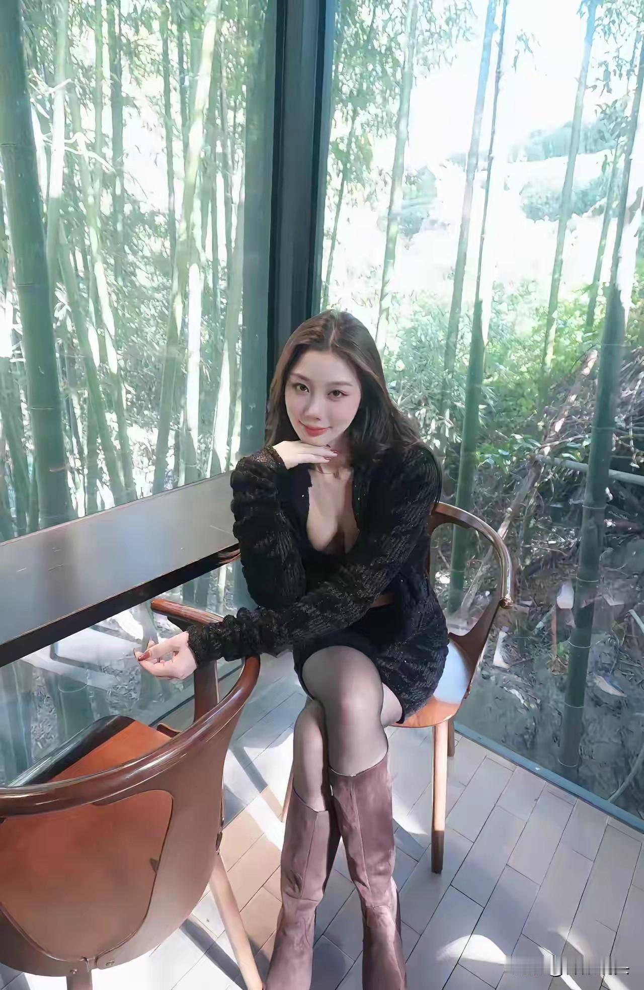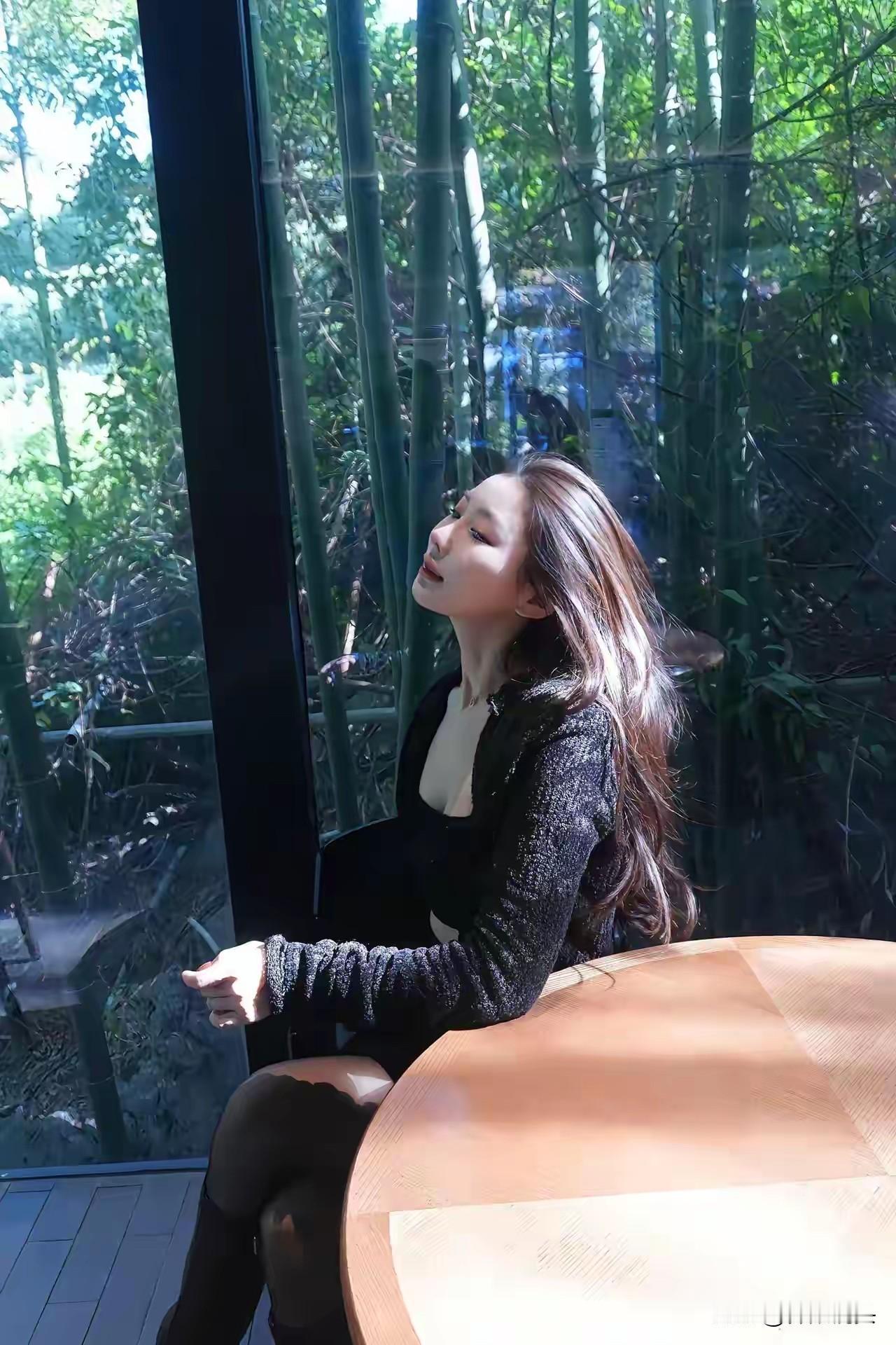 阳光洒进竹林,优雅女子静坐,享受宁静时光。