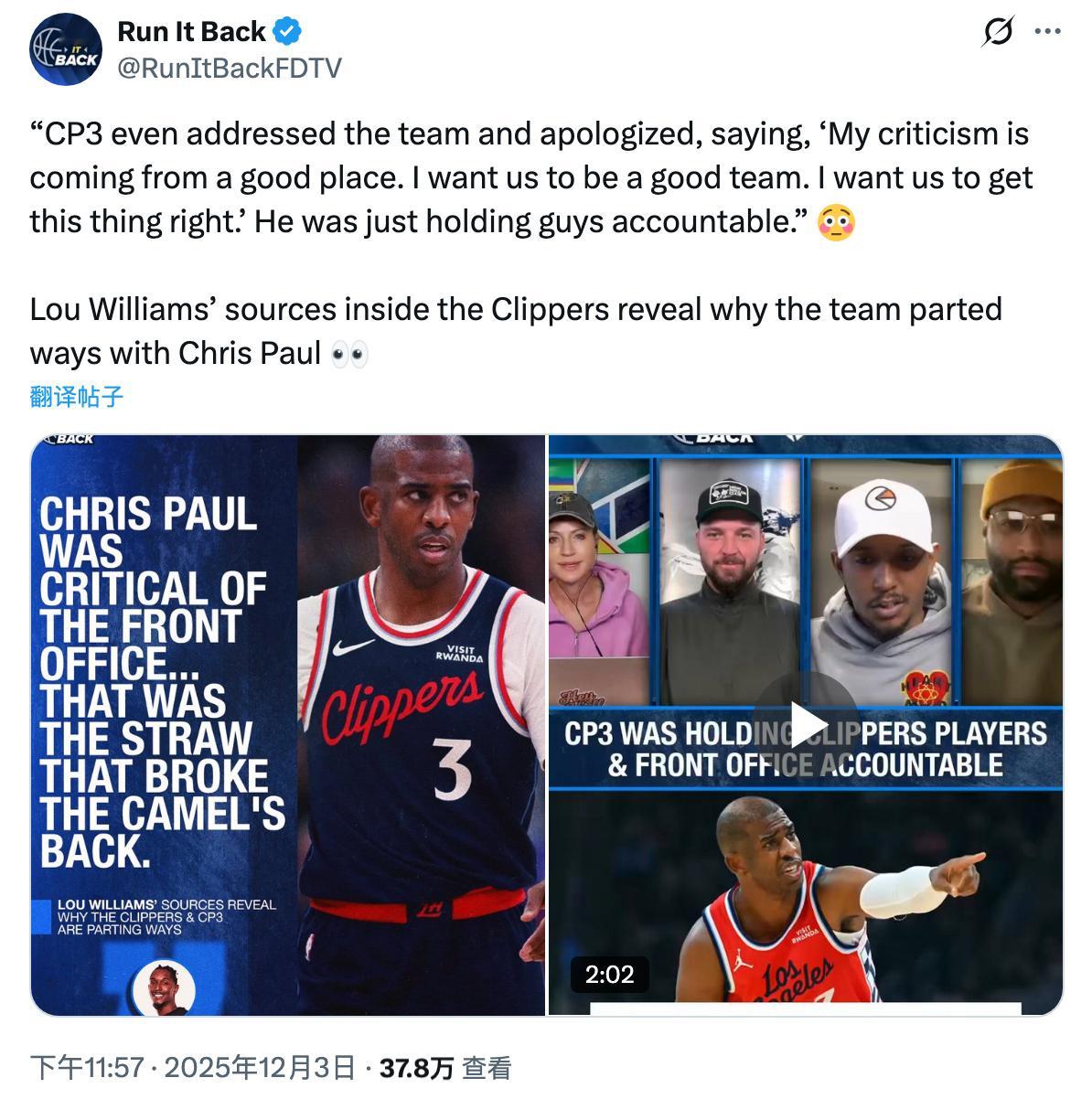 卢威聊保罗和快船分手的内情:“他(克里斯·保罗)让人们承担责任,上至(洛杉矶快船队)管理层,下至球员和教练组。……他对管理层也提出了批评。”“克里斯·保罗甚至对全队讲话并道了歉,他说:‘我的批评是出于好意。我希望我们成为一支优秀的球队。我希望我们能把事情做对。’ 他只是在要求大家负责/对自己的行为负责。”快船裁掉保罗