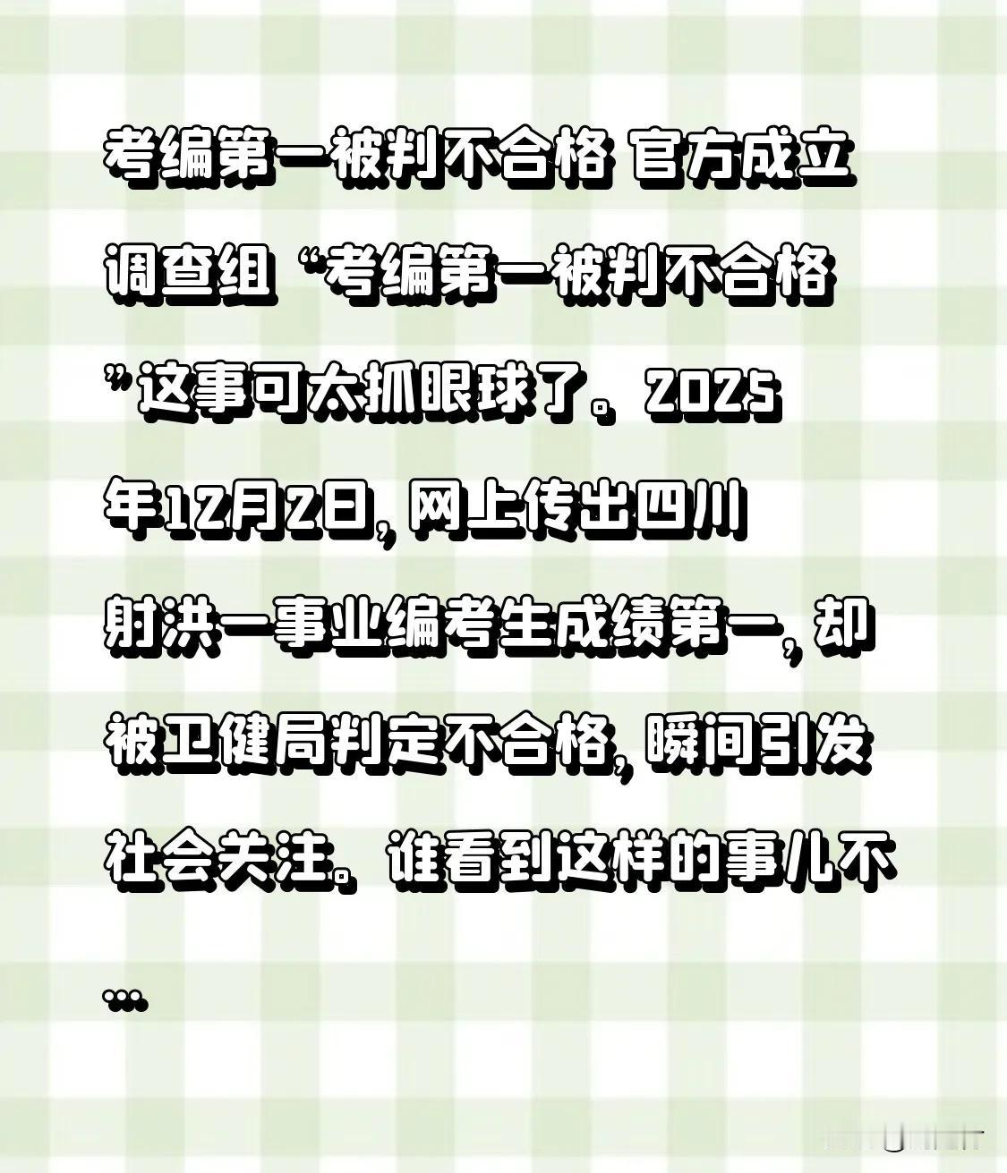 考编第一被判不合格 官方成立调查组 考编第一被判不合格 官方成立调查组 “考编第一被判不合格” 此事十分抓眼球 2025年12月2日 网上传出消息 四川射洪一事业编考生 成绩第一却被卫健局判定不合格 瞬间引发社会关注 谁见此情况 心里都会“咯噔”一下 为考生捏把汗 好在射洪市人社局反应迅速 12月3日晚发布通报 第一时间成立调查工作组 对相关情况全面、审慎复核 这既体现对考生负责 也彰显对招聘公正负责的态度 希望调查结果早日公布 给考生和大众明白交代 考编 公务员落榜 教师编体检复检 事业编总成绩 无编考试 卫生考编