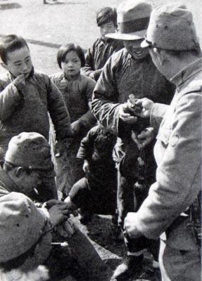 南京被日军占领14天后,一名日本兵蹲下身,右手拿着几张纸币,正递给一个中国小女孩。 周围围着6-7个中国儿童和两三个大人,全都盯着那几张钱看。 日本兵满脸笑容,几个孩子表情僵硬,有人勉强咧嘴。后面空旷的土路和残破房屋,明显是刚被占领的城市废墟。照片里那几张纸币极大概率是从被杀的中国人身上抢来的“中华民国法币”,或者刚印好的“军票”(日军强迫流通的假币)。 日方标注: 「こちらはX那事変画報の影山特派員撮影写真。南京占領の14日後、南京の中国人家族に紙幣を渡す一人の日本兵の姿です」 翻译:这是《X那事变画报》影山特派员拍摄的照片。南京占领14天后,一名日本兵把纸币发给中国家庭。
