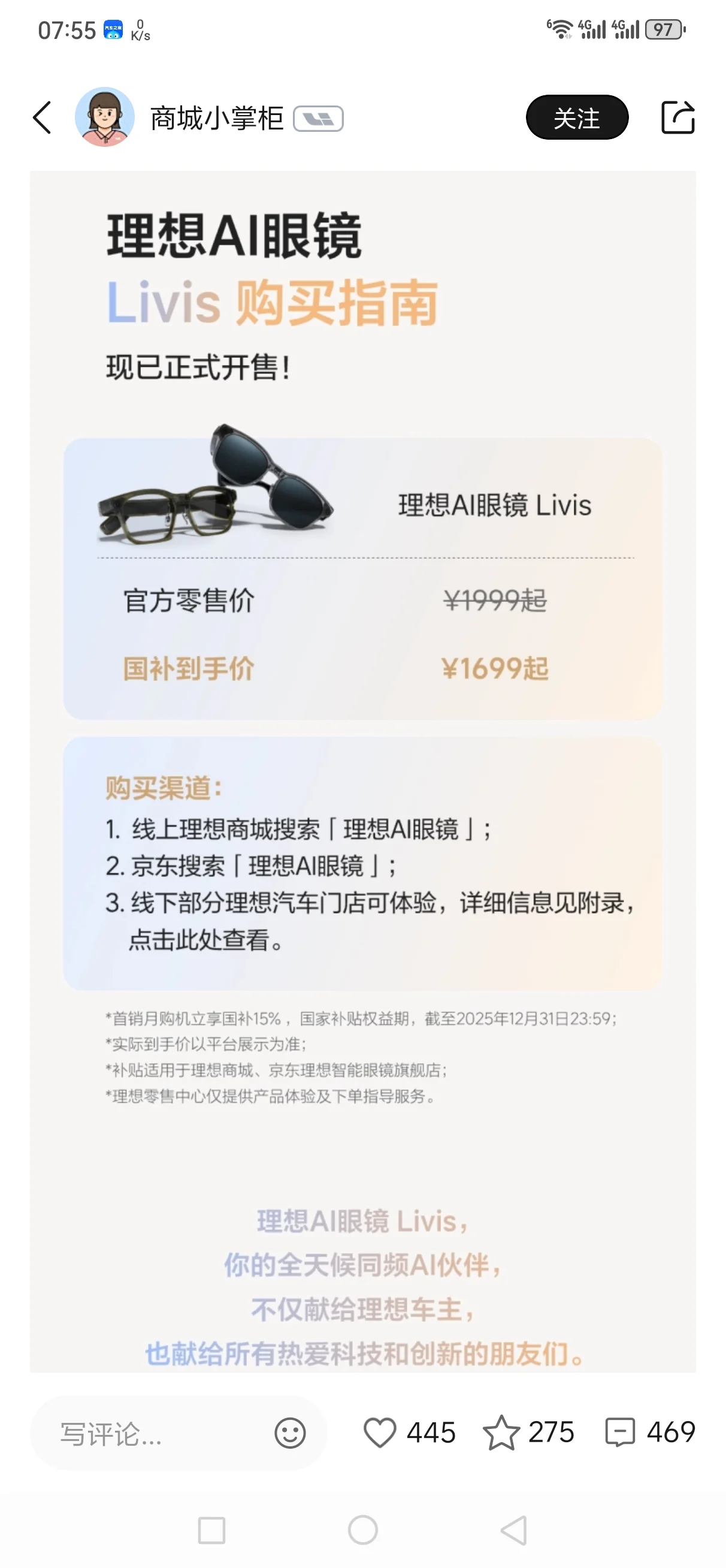 理想汽车发布理想ai眼镜Livis,优惠后最低价1699元起,该产品聚焦将车内智