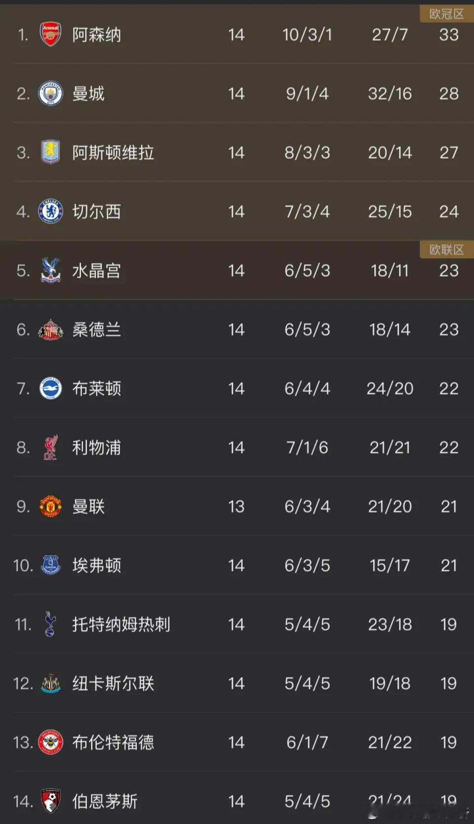 英超综述:阿森纳5分领跑 切尔西利物浦翻车不胜 维拉6连胜升第3 北京时间12月4日,英超第14轮再赛6场。切尔西和利物浦均在本轮翻车不胜,而阿森纳则在主场奏凯后连续11轮不败。在上轮伦敦德比憾平切尔西后,本轮回到主场的枪手凭借梅里诺和萨卡在开场和补时阶段的进球,2-0击败实力不俗的布伦特福德,联赛11轮不败,各项赛事则是18场不败。14轮过后,阿森纳积33分,积分榜以5分优势领跑。而本轮切尔西在轮换阵容后爆冷1-3不敌利兹联,切尔西遭遇2轮不胜后14轮积24分,滑落至第4位。卫冕冠军利物浦表现依然没有太大改观,被升班马桑德兰在主场1-1逼平,最近5场比赛仅取得1胜,若不是基耶萨补时阶段破坏空门,红军又将遭遇绝杀输球。14轮后,利物浦仅积22分暂列第8位。本轮维拉在客场4-3击败布莱顿,豪取6连胜,14轮积27分升至第3位。而狼队本轮0-1输给诺丁汉森林后已经遭遇8连败,2平12负仅积2分,继续垫底。