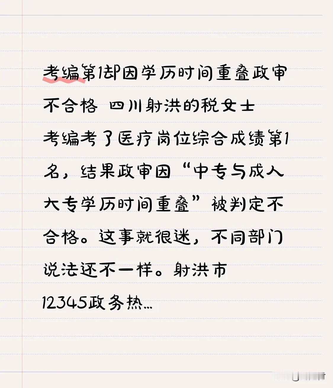 考编第1却因学历时间重叠政审不合格 考编第1 却因学历时间重叠政审不合格 四川射洪税女士 考医疗岗位综合成绩第1 政审却因“中专与成人大专学历时间重叠” 被判定不合格 这事很迷 不同部门说法不一 射洪市12345政务热线受理中心和卫健局 认为她违背报考条件 存在“学历套读”违规 南充市人社局称 主要看学历取得渠道和证书是否合规 射洪市教育招生考试委员会办公室 也证明她符合当年报考条件 12月3日晚 当地通报会复核 税女士报考时如实交材料 笔试面试学历审核都通过 政审却口头说不合格 还无正式文件和依据 “神仙打架”后果让考生承担 太憋屈 希望有公正结果 考编考公体检 公务员体检政审 四川事业编体检 职业政审 学历倒查 教师编体检复检 升学政审