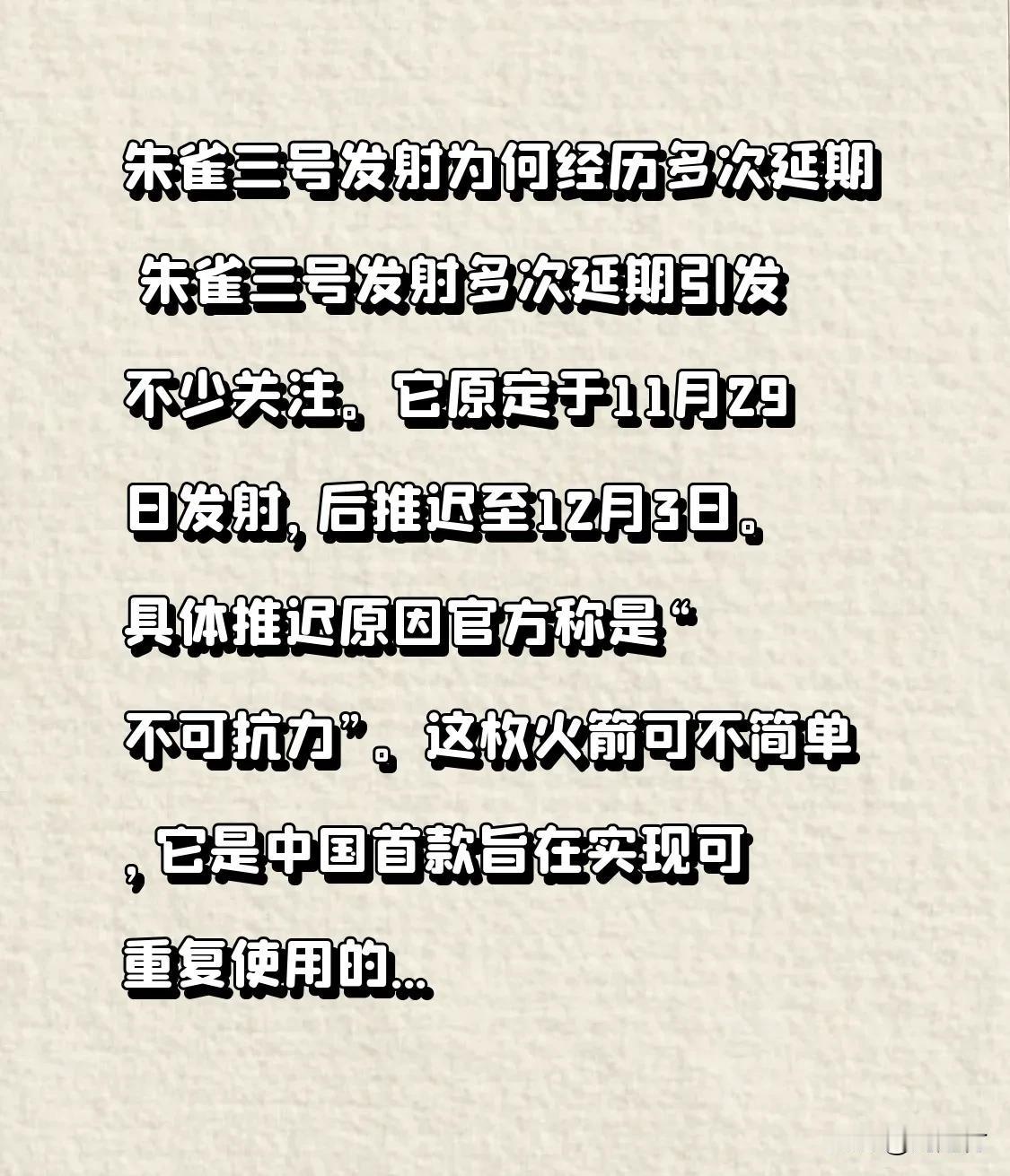 朱雀三号发射为何经历多次延期 朱雀三号发射为何历经多次延期 朱雀三号发射多次延期 引发诸多关注 它原定于11月29日发射 后推迟至12月3日 官方称具体推迟原因是“不可抗力” 此枚火箭非比寻常 它是中国首款 意在实现可重复使用的大型液体运载火箭 全箭总长76.6米 整流罩直径5.2米 运载能力颇为可观 未来火箭一子级可重复使用次数可达20次 2023年8月立项 此后进展迅猛 完成多次关键试验 虽延期令人心急 但航天本就挑战重重 每次延期或许都是为求万无一失 期待它后续带来更多惊喜 朱雀三号火箭 神州20号火箭 长征五号乙火箭 朱雀2号火箭 长征三号丙火箭