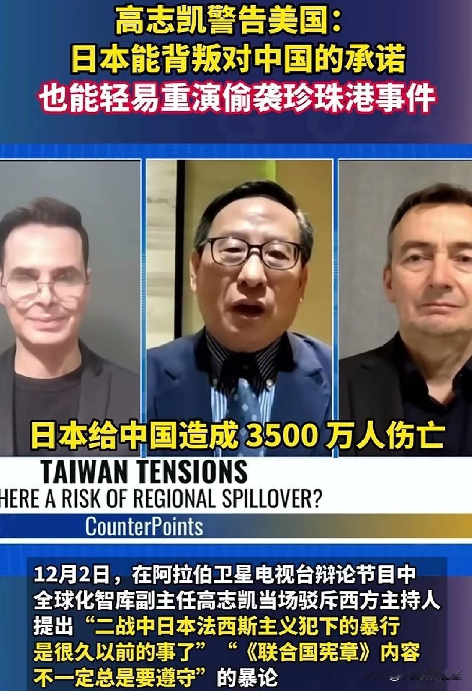 高志凯提醒与警告美国:日本能背叛对中国的承诺,也能再次发动“珍珠港”事件! 这是在阿拉伯电视台辩论节目中,高志凯驳斥西方主持人所谓的“二战日本犯下的罪已经过去很久了”的言论表示斥责! 11 月 20 日 普京总统在莫斯科举行的“追求化堡 80 周年”的论坛上表示:追究纳粹罪行绝无时效的限制,普京的表态旨在巩固纽伦堡审判确立的国际法准则,这些准则被视为清算纳粹罪行、反对战争罪行的重要基础。‌ 当前,一些势力试图歪曲或淡化纳粹历史,这种行为不仅伤害受害国人民的感情,还可能为极端思想的抬头埋下隐患。因此,普京的发言被解读为对历史虚无主义的抵制,强调铭记历史是为了防止悲剧重演,而非延续仇恨!同时追究战争罪行的永久性原则! 而高志凯所提出的担扰就是二战后的日本法西斯主义正在抬头,军国主义分子正在复活,这是全世界正义的国家都需要警惕的,特别对于当下日本背叛对中国建交时的承诺,企图再次“入侵”中国的企图,这正是日本首相亲口说出来的话同时再结合日本自卫队当下正在为军事行动做准备,种种迹象来看,日本军国主义分子正在抬头,所以必须将日本这种军国义义复活的苗头当即掐断,否则后果不容设想! 而作为日本背后的美国,不要向日本传递错误信号,包括不能放松对日本的控制, 美国为了挣点钱向日本出售进攻型武器,为日本输送核潜艇等等,美国这种动作很有可能为将来日本再次偷袭发动类似的“珍珠港事件”埋下祸根!美国人也不要忘了曾经投下的 2 颗原子弹,日本人正记恨在心,20 万日本的失去生命 虽然过去了 80 年了,但美国不应该认为日本人忘记了,日本正在积结能量,期待有朝一日复仇的机会。 所以高志凯公共平台上所表达的对于日本在二战所犯下的罪行将是永久追究而不可能过时的,追究的目的就是为了吸取教 训,预防悲剧再次上演,而日本应当承担作为一个战败国的责任不能再走军国义老路。 更是提醒美国,及其它战胜国及受法西斯侵略的国家,要共同合作维护二战有胜利成果,共同 抵抗法西斯主义再次抬头,日本敢对中国背信弃义,也敢对美国或其它国家再次发动侵略。