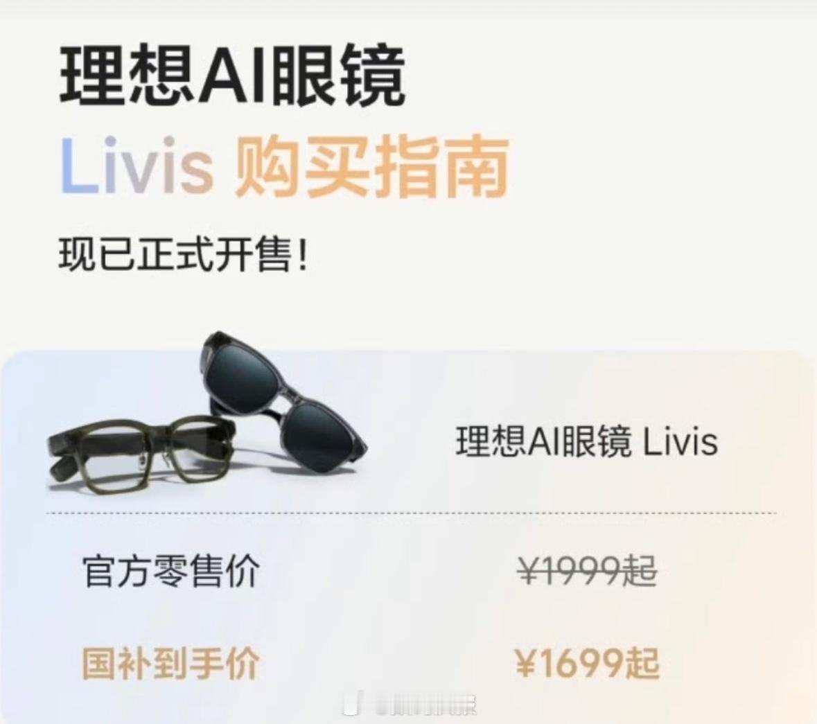 理想汽车首款AI眼镜Livis,能拍视频,能听歌,能接打电话,有语音助手,重36克,支持眼镜盒充电,Android 8.0 或 iOS 15.0 及以上版本使用。国补价格1699元。新机来了