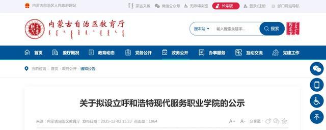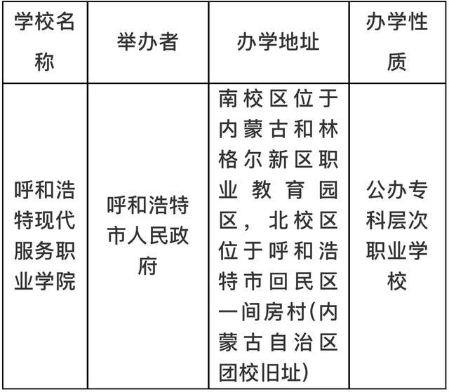 为推动落实《内蒙古自治区“十四五”高等学校设置规划》,根据《中华人民共和国高等教育法》《高等学校设置标准(试行)》《教育部关于“十四五”时期高等学校设置工作的意见》等有关规定,经自治区高等学校设置评议专家组考察评议,自治区教育厅党组会议研究通过,现对拟提请自治区人民政府审批设立呼和浩特现代服务职业学院事项予以公示。