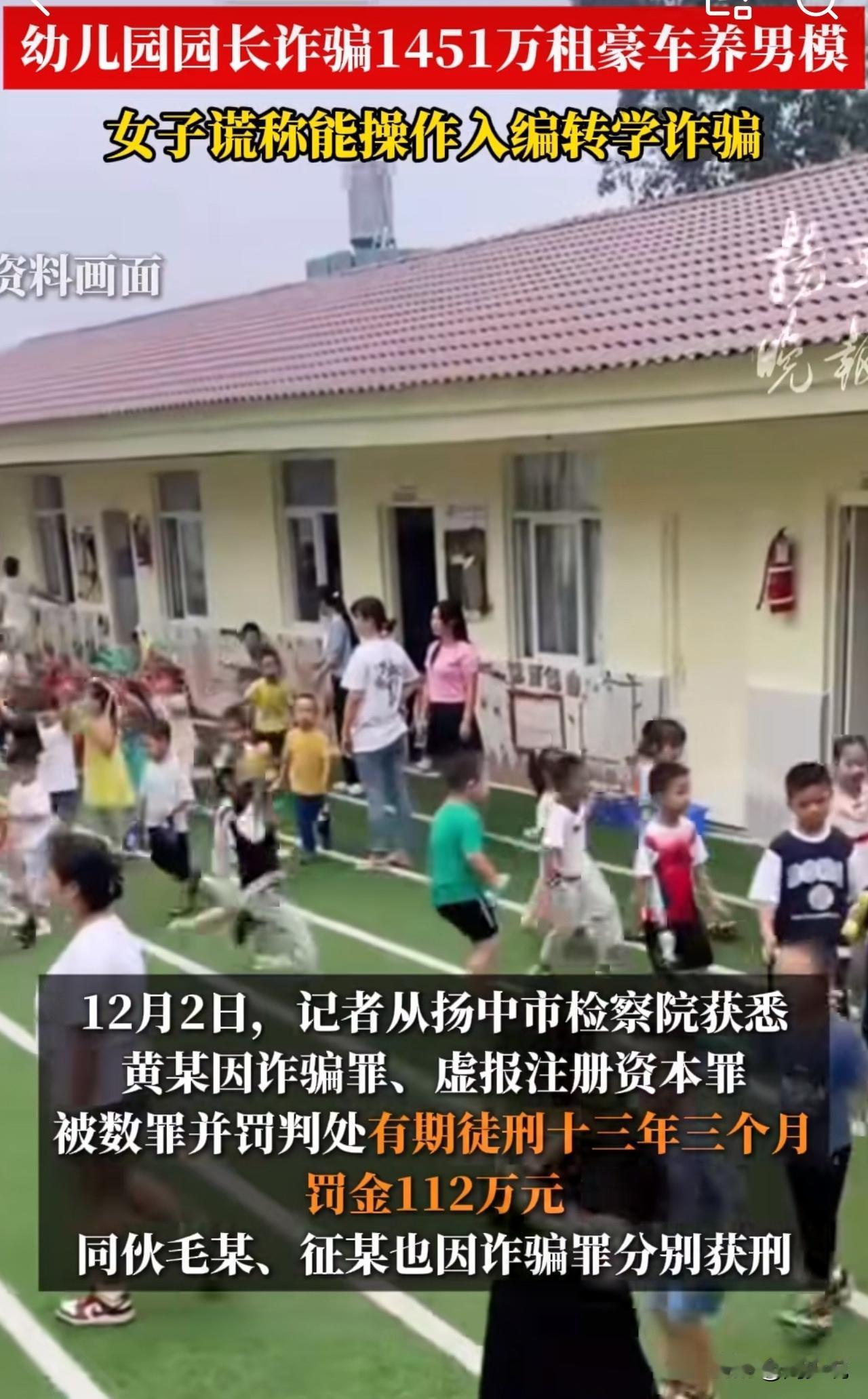 #MCN双量进阶计划#惊!90后园长诈骗1451万,竟用赃款租豪车养男模! 江苏镇江一名“90后”女子黄某,顶着幼儿园园长和人力资源公司老板的光环,声称能包办孩子转学、体制内入编等“难事”,在2020年10月至2024年4月间,疯狂诈骗10名被害人共计1451万余元! 近日,她因诈骗罪、虚报注册资本罪被数罪并罚判处有期徒刑十三年三个月,同伙也分别获刑。 看完这事,周少不得不说真的被惊讶到了,身为幼儿园园长,竟然诈骗1451万,更离谱的是,利用这笔脏款不是投资,而是租豪车养男模,三观炸裂。 该园长的行径不仅是法律的践踏,更是对社会信任的破坏。她抓住人们急于求成的心理,用虚假身份编织骗局,将赃款用于奢靡消费,性质极其恶劣。 这也提醒大家,面对“花钱办大事”的诱惑一定要保持清醒,任何正规渠道的事务都没有捷径可走,切勿因一时心急落入诈骗陷阱,守护好自己的财产安全。#寻美三湘# #长沙新朋友#
