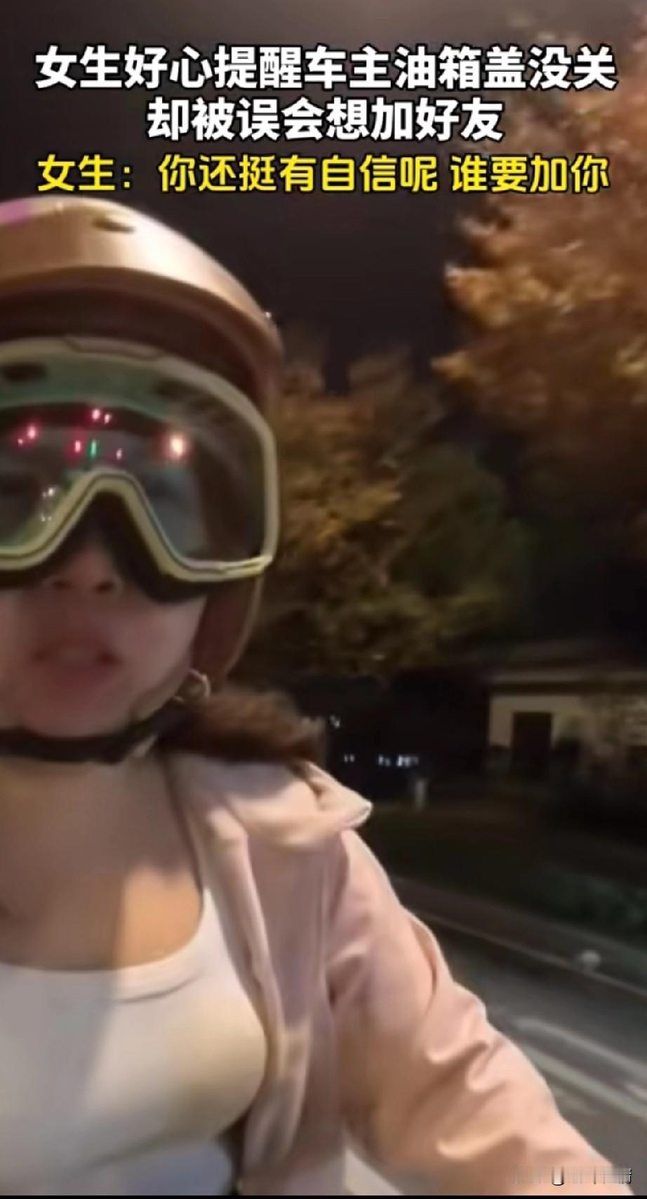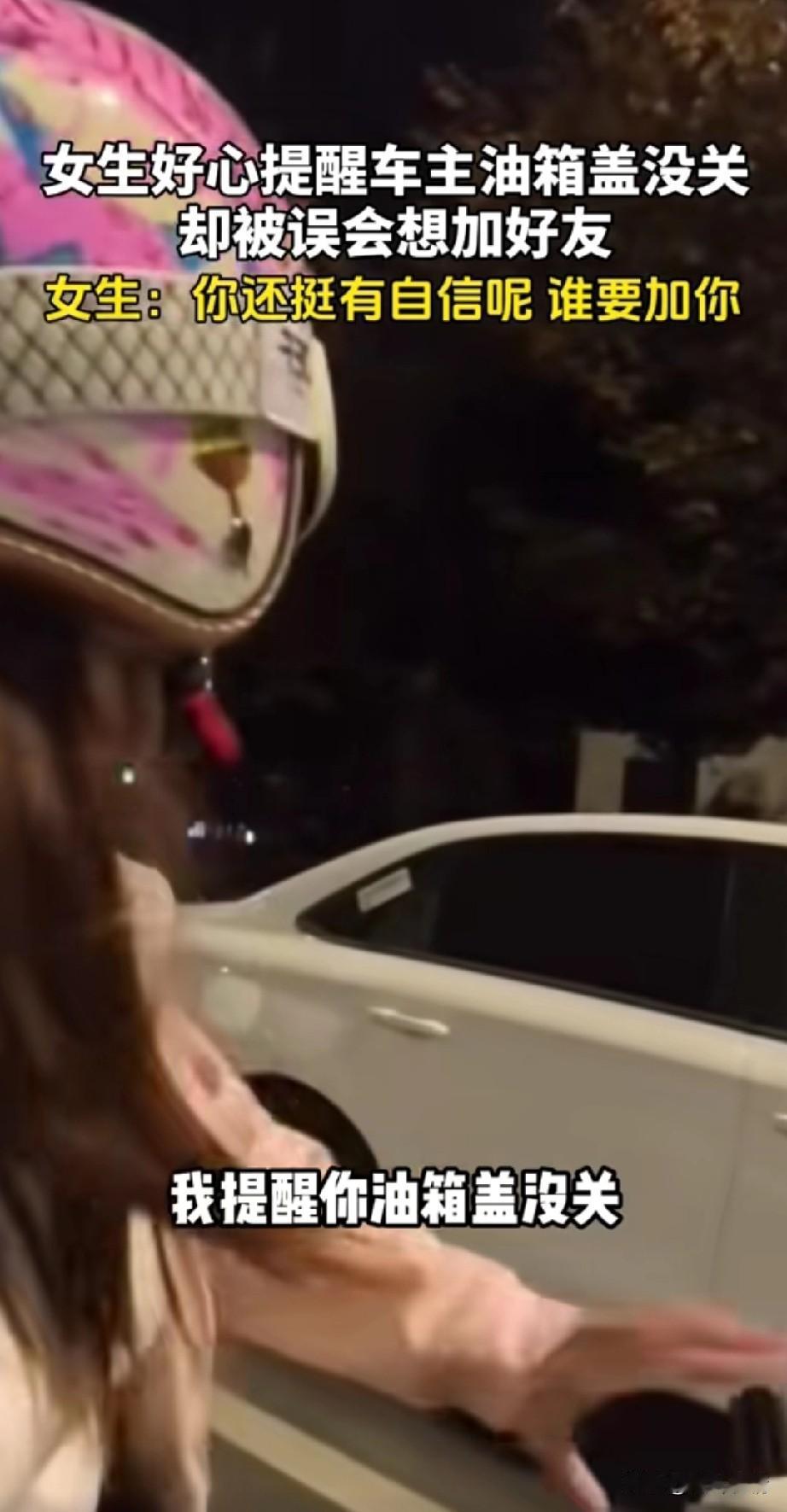 近日江苏一辆白车油箱盖没有关, 骑车的女生发现后, 好心追上白车帅气司机, 喊话司机,还要告诉司机油箱盖没关, 她还没开口, 司机表示不加微信, 女生说不是这事, 白车加速离开, 女生再次追上了白车, 白车男司机表示说了不加微信, 我不喜欢胖子, 这可把女骑手气坏了, 大喊我只是想提醒你油箱盖没关, 你个普信男! 说要之后直接就走了, 现在不仅女生很自信, 有些男生也很自信, 大家对于这位普信男怎么看? 江苏 女骑手 白车司机 油箱盖打不开 女司机亮证事件 无锁油箱盖