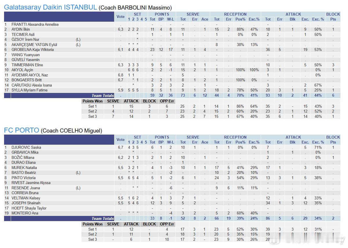 女排欧联杯,王媛媛没有登场,欧联杯首show等下一场。加拉塔萨雷3-0横扫波尔图体育主客场双杀对手晋级16强,格罗贝尔纳23分,伊尔金卡11分,蒂默曼9分(10扣5中3拦1发),塞拉8分(20扣5中3失1被拦,1拦2发)。加拉塔萨雷在十六进八的对手将是🇨🇿利贝雷茨 vs 🇧🇪鲁瑟拉勒 这场比赛的胜者女排国际排坛动态
