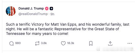 【黄金时代】川普祝贺马特·范·埃普斯在田纳西州赢得国会选举川普:祝贺马特·范·埃普斯在伟大的田纳西州赢得国会选举!激进的左翼民主党人使尽浑身解数攻击他,包括数百万美元的竞选资金。共和党又迎来了一个辉煌的夜晚!——特朗普总统昨晚,马特·范·埃普斯和他优秀的家人取得了如此巨大的胜利。他将成为田纳西州未来多年的杰出代表!美国和欧洲当代史川普主义研究热点现场海外新鲜事