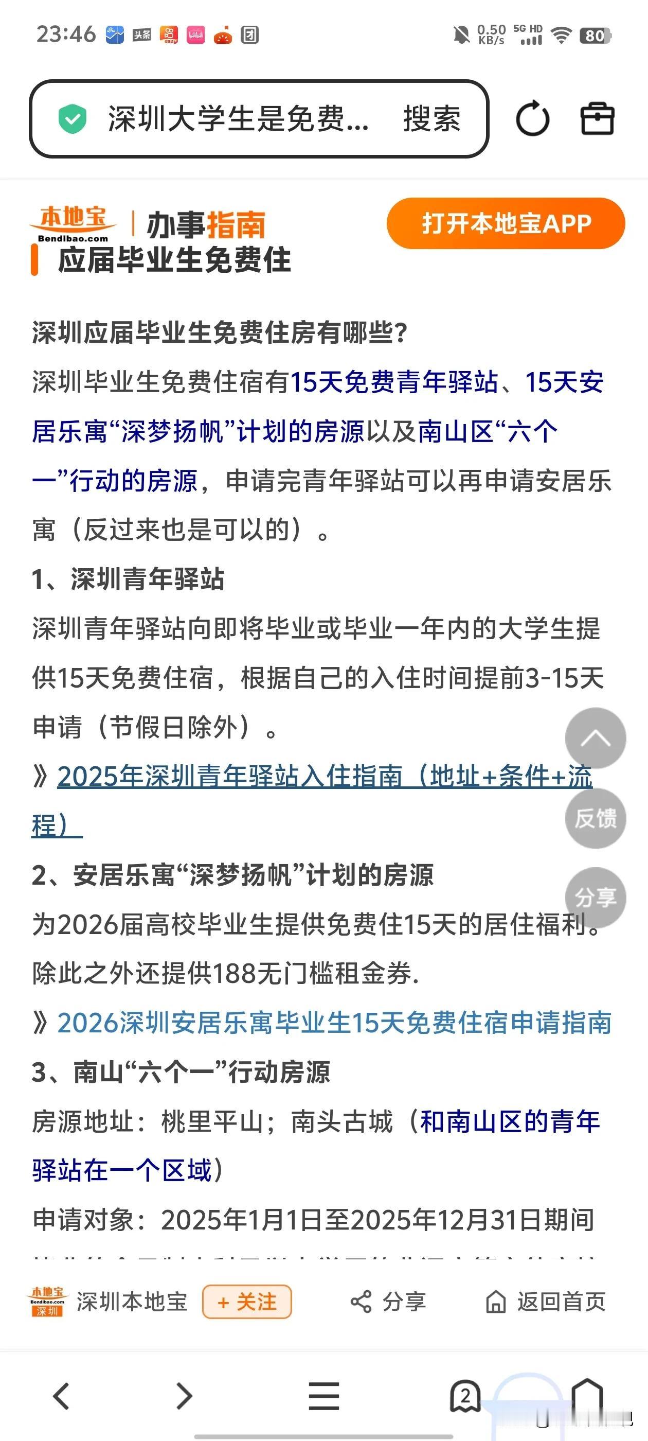 深情友爱,“圳”在温暖!深圳市面向外地求职的应届大学生和毕业一年内大学生提供多种免费居住计划,最长达15天。深圳市级层面的主要有“扬帆计划”和“深圳青年驿站”,各区还有自己的青年免费住房计划。有求者可以在深圳市官网搜索关键字查询详情,或来电咨询深圳市民热线“0755—12345”有关信息。另附,深圳人才驿站也为应届大学生和毕业一年内大学生提供最多7天的免费居住。但不能和“青年驿站计划”同享。