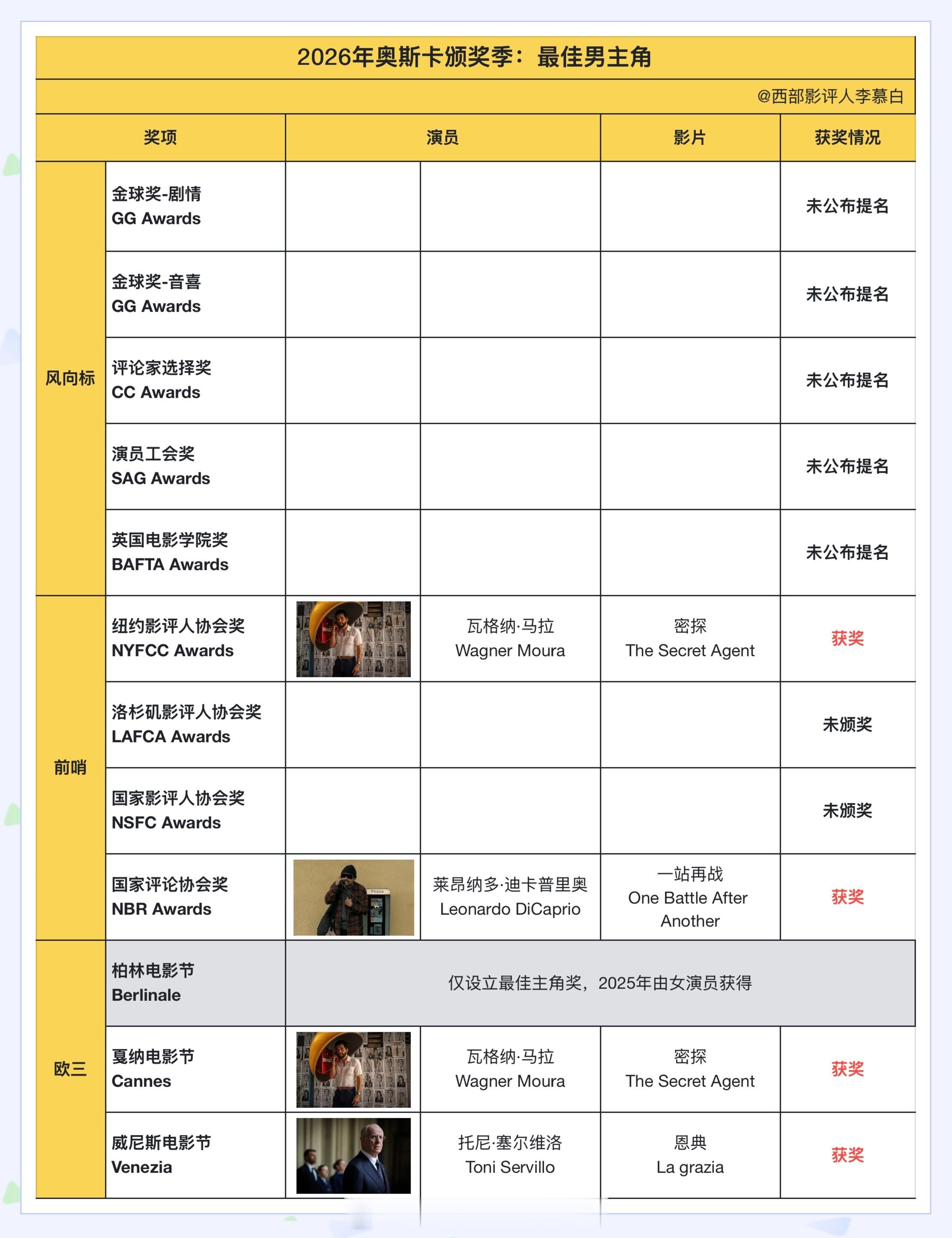奥斯卡 前哨第二站国家影评人协会奖公布获奖名单,PTA《一站再战》大获全胜,拿下最佳影片、最佳导演、最佳男主角、最佳男配角、最佳新人突破奖。小李子进入影帝争夺战线,头号种子萝丝·拜恩再次无悬念拿下最佳女主角主要获奖名单如下:最佳影片:《一站再战》最佳导演:保罗·托马斯·安德森《一站再战》最佳男主角:莱昂纳多·迪卡普里奥《一站再战》最佳女主角:萝丝·拜恩《如果有退,我会踢你》最佳男配角:本尼西奥·德尔·托罗《一站再战》最佳女配角:英加·伊布斯多特·莉莉亚斯《情感价值》最佳原创剧本:《罪人》最佳改编剧本:《火车梦》最佳动画电影:《彩虹》最佳国际影片:《普通事故》