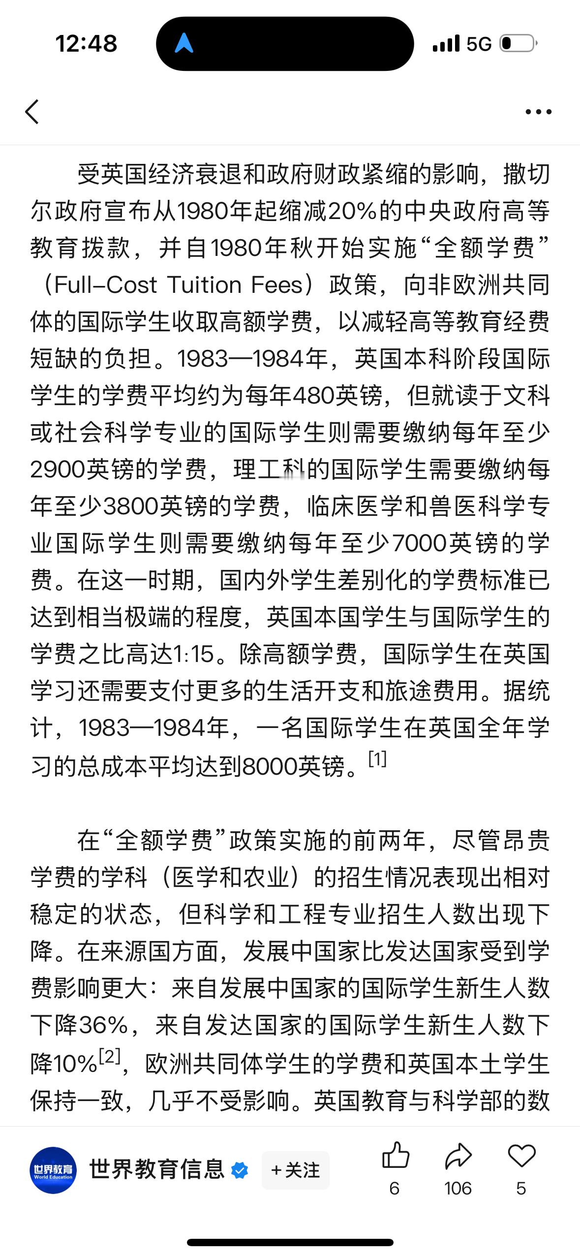 撒切尔是许多英区留子结下「一年英水硕,一生英伦情」的祖师奶奶。正是在她上台后,英国留学教育大踏步走向产业化、市场化模式,成为英国政府的重要创收方式。从这篇文章的梳理也能管窥近四十年物价上升的程度。1983—1984年,一名国际学生在英国全年学习的总成本平均达到8000英镑。疫情后,按照目前英镑的汇率,一名中国留子到英国留学一年,总成本60万—100万人民币(约6—11万英镑)不算夸张。最近英政府也宣布了一个新政,将对大学征收6%留学生税,即学费总额的6%。以疫情爆发的2019—2020年为标志,近五年英国留学学费其实是又激增了一轮。原文链接:网页链接
