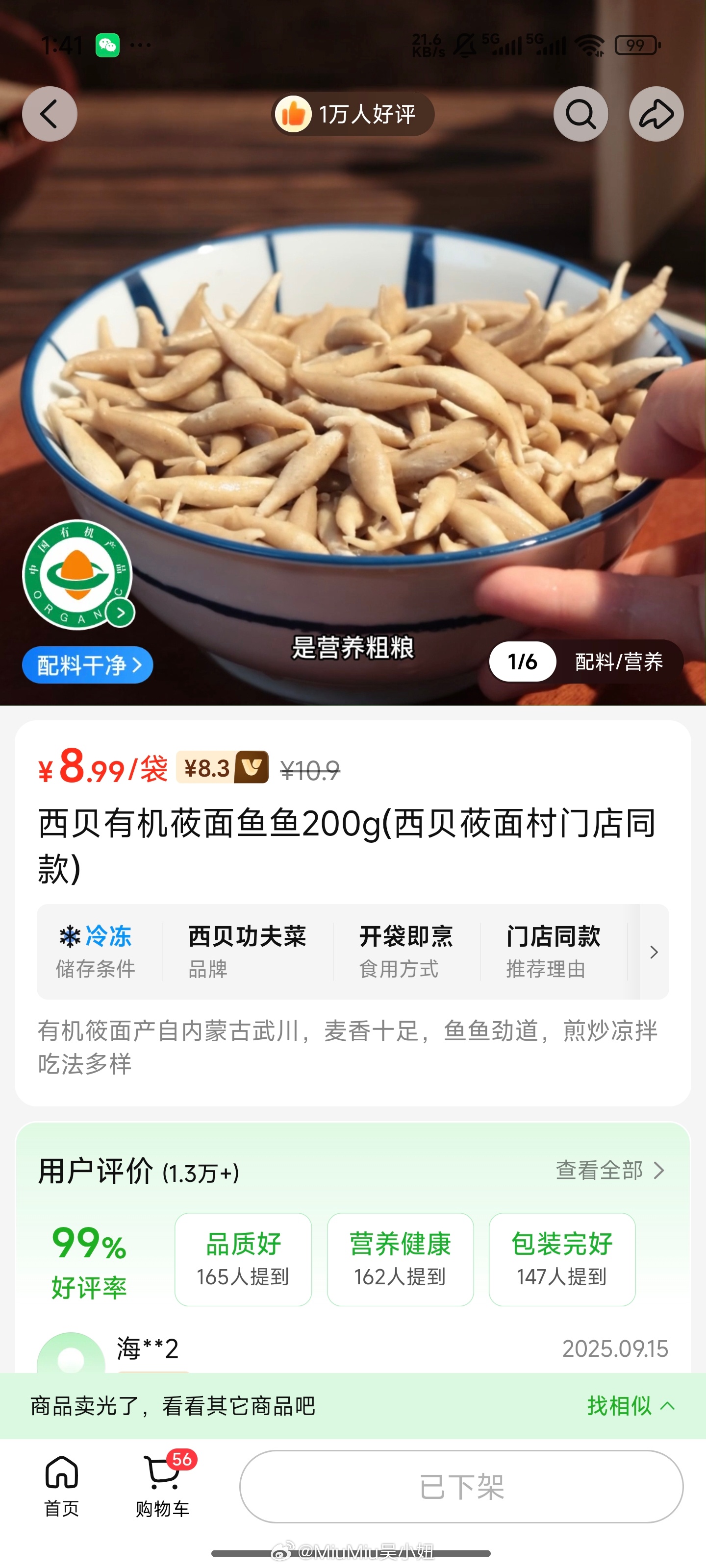 讲真,还是不一样西贝垮的,毕竟这个预制小鱼面还是挺好吃的~(我那面食爱好者小妞最爱吃小鱼面面)可是自己在家做的价格还是贵了点~自己还加了一巴掌面积的肉沫和一个新鲜番茄,煮完盛出来也就两小饭碗的量~(成年人吃的话就一人份)而它本身的汤料包里只有一些浓缩西红柿酱(可以理解为半个笑厨西红柿罐头),没有肉~而这一包就20元了~要不是小象超市的小鱼面下架了(纯面没汤包~9元),我也不会花大价钱在盒马买这60元三袋面